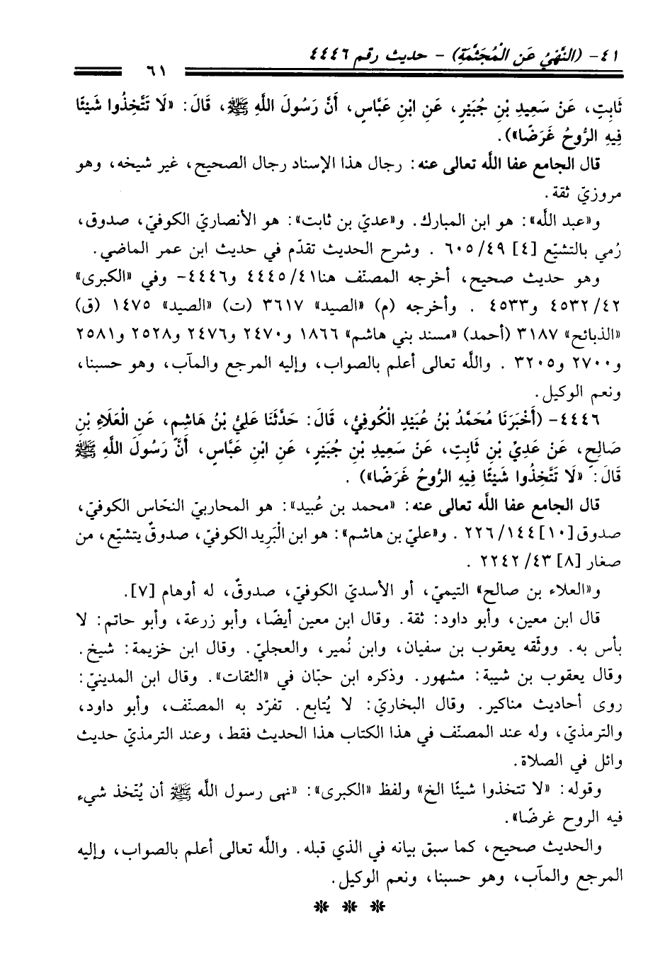 4446 - (أَخْبَرَنَا مُحَمَّدُ بْنُ عُبَيْدٍ الْكُوفِيُّ، قَالَ: حَدَّثَنَا عَلِيُّ بْنُ هَاشِمٍ، عَنِ الْعَلاَءِ بْنِ صَالِحٍ، عَنْ عَدِيِّ بْنِ ثَابِتٍ، عَنْ سَعِيدِ بْنِ جُبَيْرٍ، عَنِ ابْنِ عَبَّاسٍ، أَنَّ رَسُولَ اللَّهِ -صلى الله عليه وسلم- قَالَ: "لاَ تَتَّخِذُوا شَيْئًا فِيهِ الرُّوحُ غَرَضًا").