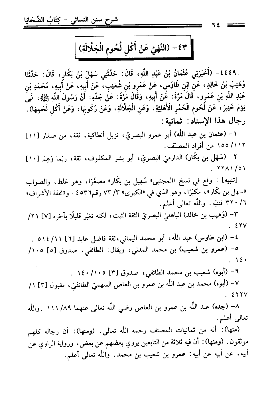 4449 - (أَخْبَرَنِي عُثْمَانُ بْنُ عَبْدِ اللَّهِ، قَالَ: حَدَّثَنِي سَهْلُ بْنُ بَكَّارٍ، قَالَ: حَدَّثَنَا وُهَيْبُ بْنُ خَالِدٍ، عَنِ ابْنِ طَاوُسٍ، عَنْ عَمْرِو بْنِ شُعَيْبٍ، عَنْ أَبِيهِ، مُحَمَّدِ بْنِ عَبْدِ اللَّهِ بْنِ عَمْرٍو، قَالَ: مَرَّةً عَنْ أَبِيهِ، وَقَالَ مَرَّةً: عَنْ جَدِّهِ: أَنَّ رَسُولَ اللَّهِ -صلى الله عليه وسلم-، نَهَى يَوْمَ خَيْبَرَ، عَنْ لُحُومِ الْحُمُرِ الأَهْلِيَّةِ، وَعَنِ الْجَلاَّلَةِ، وَعَنْ رُكُوبِهَا، وَعَنْ أَكْلِ لَحْمِهَا).