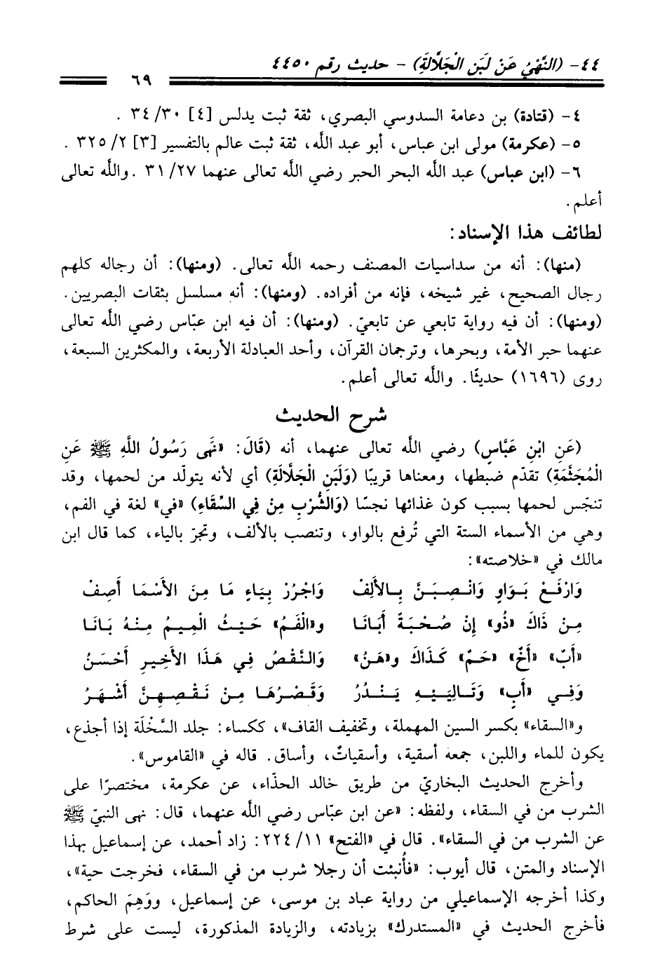 (عَنِ ابْنِ عَبَّاسٍ) رضي الله تعالى عنهما، أنه (قَالَ: "نَهَى رَسُولُ اللهِ -صلى الله عليه وسلم- عَنِ الْمُجَثَّمَةِ) تقدّم ضبطها، ومعناها قريباً (وَلَبَنِ الْجَلَّالَةِ) أي لأنه يتولّد منْ لحمها، وَقَدْ تنجّس لحمها بسبب كون غذائها نجسًا (وَالشُّرْب مِنْ فِي السِّقَاءِ) "فِي" لغة فِي الفم، وهي منْ الأسماء الستة التي تُرفع بالواو، وتنصبَ بالألف، وتجرّ بالياء، كما قَالَ ابن مالك فِي "خلاصته":