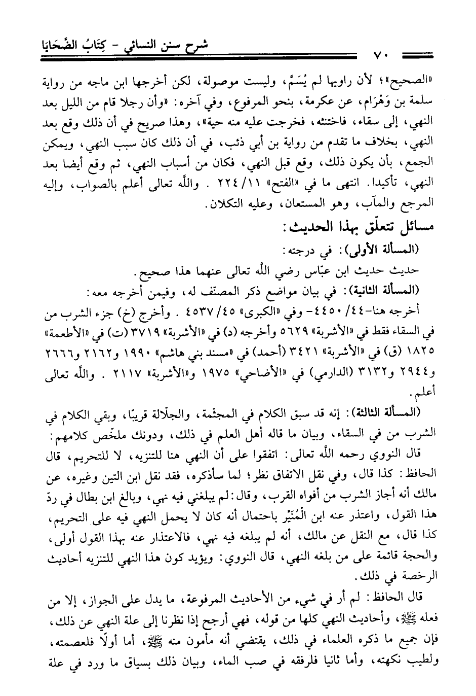 (المسألة الثالثة): إنه قد سبق الكلام فِي المجثّمة، والجلّالة قريباً، وبقي الكلام فِي الشرب منْ فِي السقاء، وبيان ما قاله أهل العلم فِي ذلك، ودونك ملخّص كلامهم: