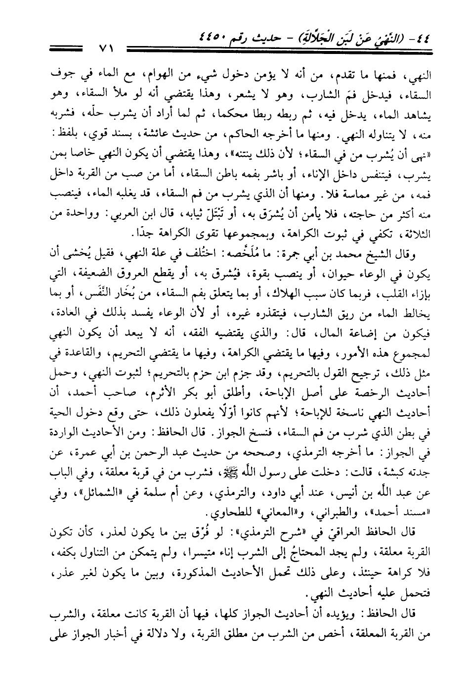 قَالَ الحافظ العراقيّ فِي "شرح الترمذي": لو فُرِّق بين ما يكون لعذر، كأن تكون القربة معلقة، ولم يجد المحتاجُ إلى الشرب إناء متيسرا، ولم يتمكن منْ التناول بكفه، فلا كراهة حينئذ، وعلى ذلك تحمل الأحاديث المذكورة، وبين ما يكون لغير عذر، فتحمل عليه أحاديث النهي.