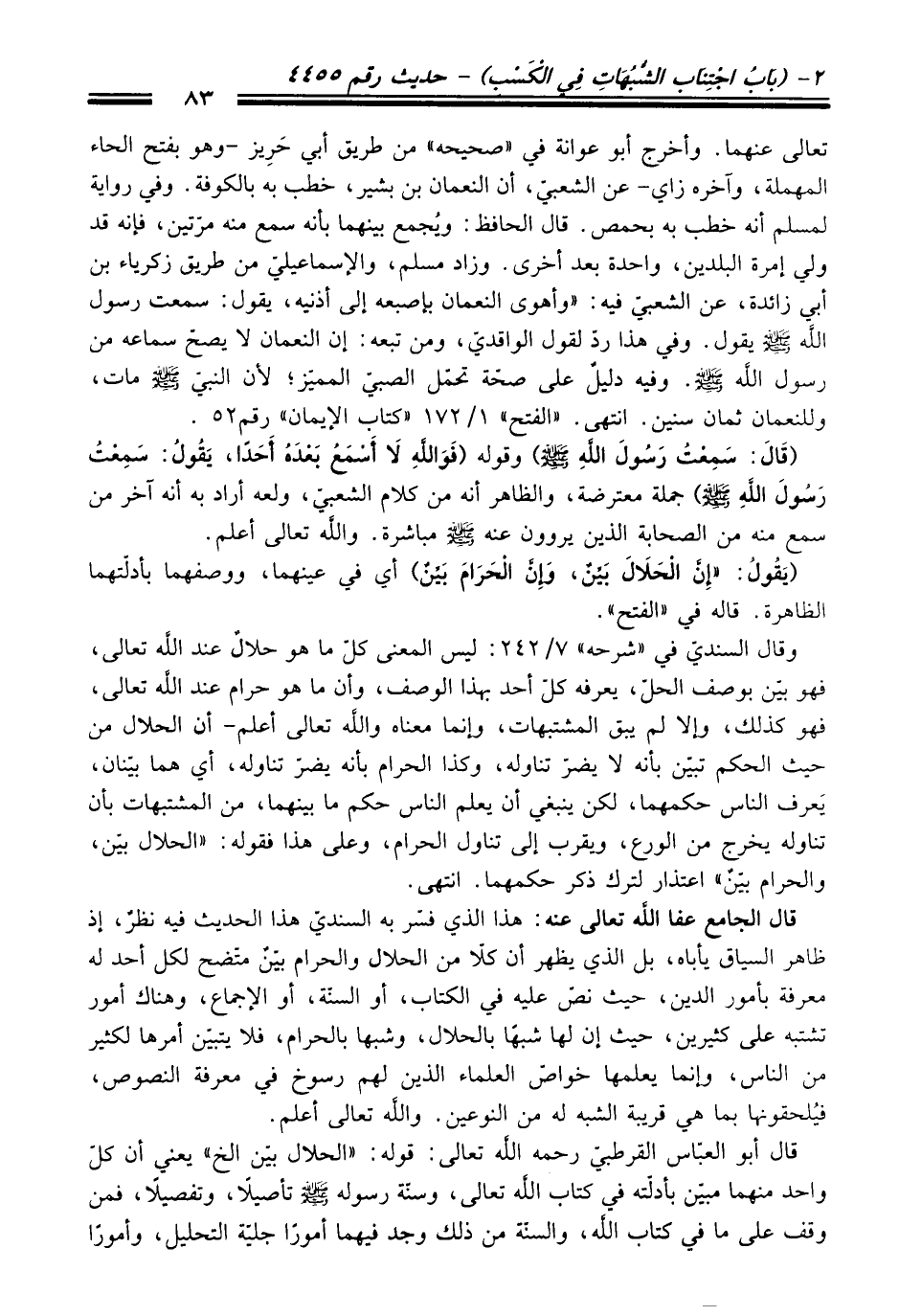 قَالَ الجامع عفا الله تعالى عنه: هَذَا الذي فسّر به السنديّ هَذَا الْحَدِيث فيه نظرٌ، إذ ظاهر السياق يأباه، بل الذي يظهر أن كلًّا منْ الحلال والحرام بيّنٌ متّضح لكل أحد له معرفة بأمور الدين، حيث نصّ عليه فِي الكتاب، أو السنّة، أو الإجماع، وهناك أمور تشتبه عَلَى كثيرين، حيث إن لها شبهًا بالحلال، وشبها بالحرام، فلا يتبيّن أمرها لكثير منْ النَّاس، وإنما يعلمها خواصّ العلماء الذين لهم رسوخ فِي معرفة النصوص، فيُلحقونها بما هي قريبة الشبه له منْ النوعين. والله تعالى أعلم.