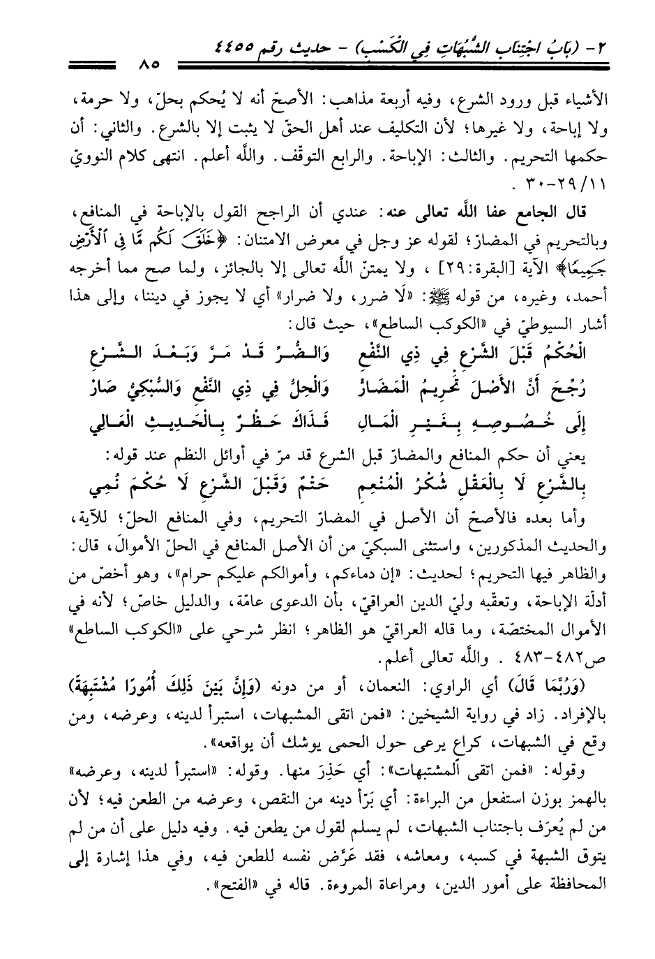 قَالَ الجامع عفا الله تعالى عنه: عندي أن الراجح القول بالإباحة فِي المنافع، وبالتحريم فِي المضارّ؛ لقوله عَزَّ وَجَلَّ فِي معرض الامتنان: {خَلَقَ لَكُمْ مَا فِي الْأَرْضِ جَمِيعًا} الآية [البقرة: 29]، ولا يمتّن الله تعالى إلا بالجائز، ولما صح مما أخرجه أحمد، وغيره، منْ قوله -صلى الله عليه وسلم-: "لَا ضرر، ولا ضرار" أي لا يجوز فِي ديننا، وإلى هَذَا أشار السيوطيّ فِي "الكوكب الساطع"، حيث قَالَ: