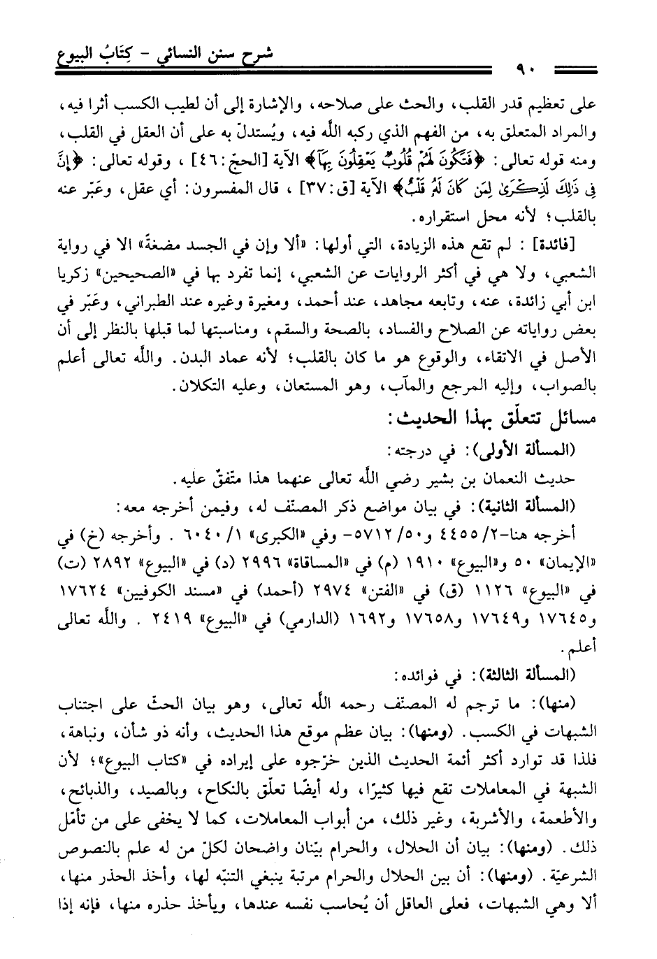 [فائدة]: لم تقع هذه الزيادة، التي أولها: "ألا وإن فِي الجسد مضغةً" إلا فِي رواية الشعبي، ولا هي فِي أكثر الروايات عن الشعبي، إنما تفرد بها فِي "الصحيحين" زكريا ابن أبي زائدة، عنه، وتابعه مجاهد، عند أحمد، ومغيرة وغيره عند الطبراني، وعَبّر فِي بعض رواياته عن الصلاح والفساد، بالصحة والسقم، ومناسبتها لما قبلها بالنظر إلى أن الأصل فِي الاتقاء، والوقوع هو ما كَانَ بالقلب؛ لأنه عماد البدن. والله تعالى أعلم بالصواب، وإليه المرجع والمآب، وهو المستعان، وعليه التكلان.