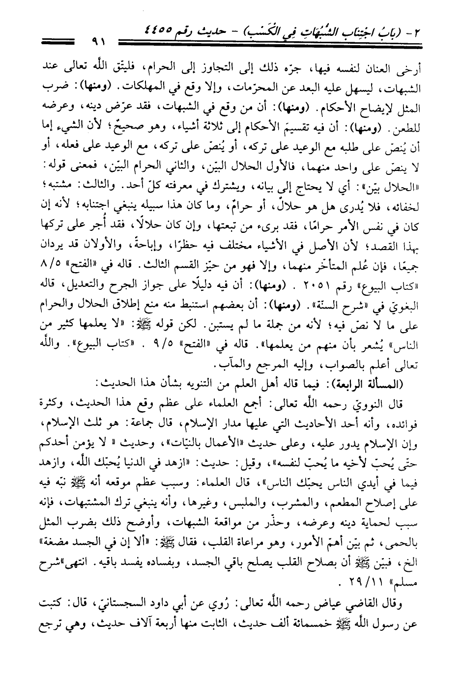 أرخى العنان لنفسه فيها، جرّه ذلك إلى التجاوز إلى الحرام، فليتّق الله تعالى عند الشبهات، ليسهل عليه البد عن المحرّمات، وإلا وقع فِي المهلكات. (ومنها): ضرب المثل لإيضاح الأحكام. (ومنها): أن منْ وقع فِي الشبهات، فقد عرّض دينه، وعرضه للطعن. (ومنها): أن فيه تقسيمَ الأحكام إلى ثلاثة أشياء، وهو صحيحٌ؛ لأن الشيء إما أن يُنصّ عَلَى طلبه مع الوعيد عَلَى تركه، أو يُنصّ عَلَى تركه، مع الوعيد عَلَى فعله، أو لا ينصّ عَلَى واحد منهما، فالأول الحلال البيّن، والثاني الحرام البيّن، فمعنى قوله: "الحلال بيّن": أي لا يحتاج إلى بيانه، ويشترك فِي معرفته كلّ أحد. والثالث: مشتبه؛ لخفائه، فلا يُدرى هل هو حلالٌ، أو حرامٌ، وما كَانَ هَذَا سبيله يبغي اجتنابه؛ لأنه إن كَانَ فِي نفس الأمر حرامًا، فقد برىء منْ تبعتها، وإن كَانَ حلالاً، فقد أُجر عَلَى تركها بهذا القصد؛ لأن الأصل فِي الأشياء مختلف فيه حظرًا، واباحةً، والأولان قد يردان جميعًا، فإن عُلم المتأخّر منهما، وإلا فهو منْ حيّز القسم الثالث. قاله فِي "الفتح" 5/ 8 "كتاب البيوع" رقم 2051. (ومنها): أن فيه دليلاً عَلَى جواز الجرح والتعديل، قاله البغويّ فِي "شرح السنّة". (ومنها): أن بعضهم استنبط منه منع إطلاق الحلال والحرام عَلَى ما لا نصّ فيه؛ لأنه منْ جملة ما لم يستبن. لكن قوله -صلى الله عليه وسلم-: "لا يعلمها كثير منْ النَّاس" يُشعر بأن منهم منْ يعلمها". قاله فِي "الفتح" 5/ 9. "كتاب البيوع". والله تعالى أعلم بالصواب، وإليه المرجع والمآب.