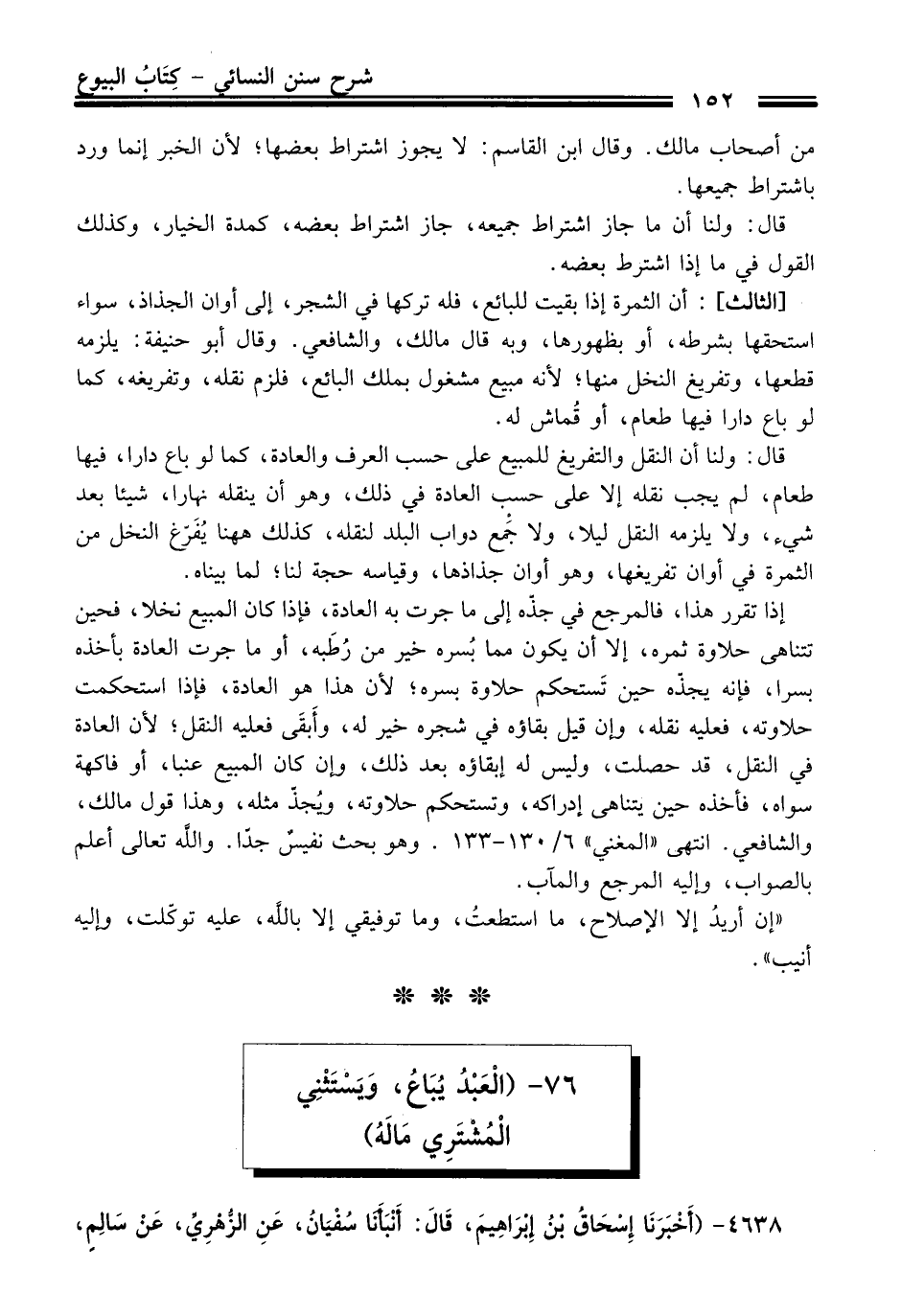 إذا تقرر هَذَا، فالمرجع فِي جذّه إلى ما جرت به العادة، فإذا كَانَ المبيع نخلا، فحين تتناهى حلاوة ثمره، إلا أن يكون مما بُسره خير منْ رُطَبه، أو ما جرت العادة بأخذه بسرا، فإنه يجذّه حين تَستحكم حلاوة بسره؛ لأن هَذَا هو العادة، فإذا استحكمت حلاوته، فعليه نقله، وإن قيل بقاؤه فِي شجره خير له، وأَبقَى فعليه النقل؛ لأن العادة فِي النقل، قد حصلت، وليس له إبقاؤه بعد ذلك، وإن كَانَ المبيع عنبا، أو فاكهة سواه، فأخذه حين يتناهى إدراكه، وتستحكم حلاوته، ويُجذّ مثله، وهذا قول مالك، والشافعي. انتهى "المغني" 6/ 130 - 133. وهو بحث نفيسٌ جدًّا. والله تعالى أعلم بالصواب، وإليه المرجع والمآب.
