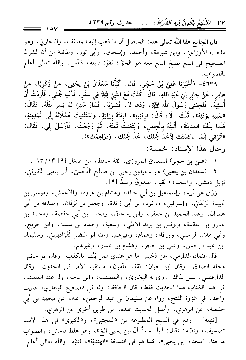 4639 - (أَخْبَرَنَا عَلِيُّ بْنُ حُجْرٍ، قَالَ: أَنْبَأَنَا سَعْدَانُ بْنُ يَحْيَى، عَنْ زَكَرِيَّا، عَنْ عَامِرٍ، عَنْ جَابِرِ بْنِ عَبْدِ اللَّهِ، قَالَ: كُنْتُ مَعَ النَّبِيِّ -صلى الله عليه وسلم- فِي سَفَرٍ، فَأَعْيَا جَمَلِي، فَأَرَدْتُ أَنْ أُسَيِّبَهُ، فَلَحِقَنِي رَسُولُ اللَّهِ -صلى الله عليه وسلم-، وَدَعَا لَهُ، فَضَرَبَهُ، فَسَارَ سَيْرًا لَمْ يَسِرْ مِثْلَهُ، فَقَالَ: "بِعْنِيهِ بِوُقِيَّةٍ"، قُلْتُ: لاَ، قَالَ: "بِعْنِيهِ"، فَبِعْتُهُ بِوُقِيَّةٍ، وَاسْتَثْنَيْتُ حُمْلاَنَهُ إِلَى الْمَدِينَةِ، فَلَمَّا بَلَغْنَا الْمَدِينَةَ، أَتَيْتُهُ بِالْجَمَلِ، وَابْتَغَيْتُ ثَمَنَهُ، ثُمَّ رَجَعْتُ، فَأَرْسَلَ إِلَيَّ، فَقَالَ: "أَتُرَانِي إِنَّمَا مَاكَسْتُكَ لآخُذَ جَمَلَكَ، خُذْ جَمَلَكَ، وَدَرَاهِمَكَ").