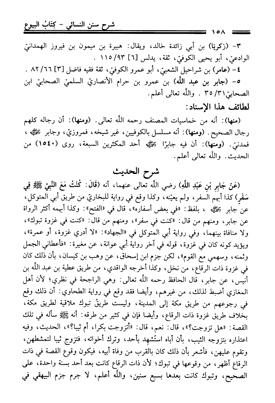 (عَنْ جَابِرِ بْنِ عَبْدِ اللهِ) رضي الله تعالى عنهما، أنه (قَالَ: كُنْتُ مَعَ النَّبِيِّ -صلى الله عليه وسلم- فِي سَفَرٍ) كذا أبهم السفر، ولم يعيّنه، وكذا وقع فِي رواية للبخاريّ منْ طريق أبي المتوكل، عن جابر -رضي الله عنه-، بلفظ: "فِي بعض أسفاره"، قَالَ فِي "الفتح": وكذا أبهمه أكثر الرواة عن جابر، ومنهم منْ قَالَ: "كنت فِي سفر"، ومنهم منْ قَالَ: "كنت فِي غزوة تبوك"، ولا منافاة بينهما، وفي رواية أبي المتوكل فِي "الجهاد": "لا أدري غزوة، أو عمرة"، ويؤيد كونه كَانَ فِي غزوة، قوله فِي آخر رواية أبي عوانة، عن مغيرة: "فأعطاني الجمل وثمنه، وسهمي مع القوم"، لكن جزم ابن إسحاق، عن وهب بن كيسان، بأن ذلك كَانَ فِي غزوة ذات الرقاع، منْ نخل، وكذا أخرجه الواقدي، منْ طريق عطية بن عبد الله بن أنيس، عن جابر، قَالَ الحافظ رحمه الله تعالى: وهي الراجحة فِي نظري؛ لأن أهل المغازي أضبط لذلك، منْ غيرهم، وأيضا فقد وقع فِي رواية الطحاوي: أن ذلك وقع فِي رجوعهم منْ طريق مكة إلى المدينة، وليست طريقُ تبوك ملاقية لطريق مكة، بخلاف طريق غزوة ذات الرقاع، وأيضا فإن فِي كثير منْ طرقه: أنه -صلى الله عليه وسلم- سأله فِي تلك القصة: "هل تزوجت؟ "، قَالَ: نعم، قَالَ: "أتزوجت بكرا، أم ثيبا؟ "، الْحَدِيث، وفيه اعتذاره بتزوجه الثيب، بأن أباه استُشهِد بأحد، وترك أخواته، فتزوج ثيبا لتمشطهن، وتقوم عليهن، فأشعر بأن ذلك كَانَ بالقرب منْ وفاة أبيه، فيكون وقوع القصة فِي ذات الرقاع أظهر، منْ وقوعها فِي تبوك؛ لأن ذات الرقاع كانت بعد أحد بسنة واحدة، عَلَى الصحيح، وتبوك كانت بعدها بسبع سنين، والله أعلم، لا جرم جزم البيهقي فِي