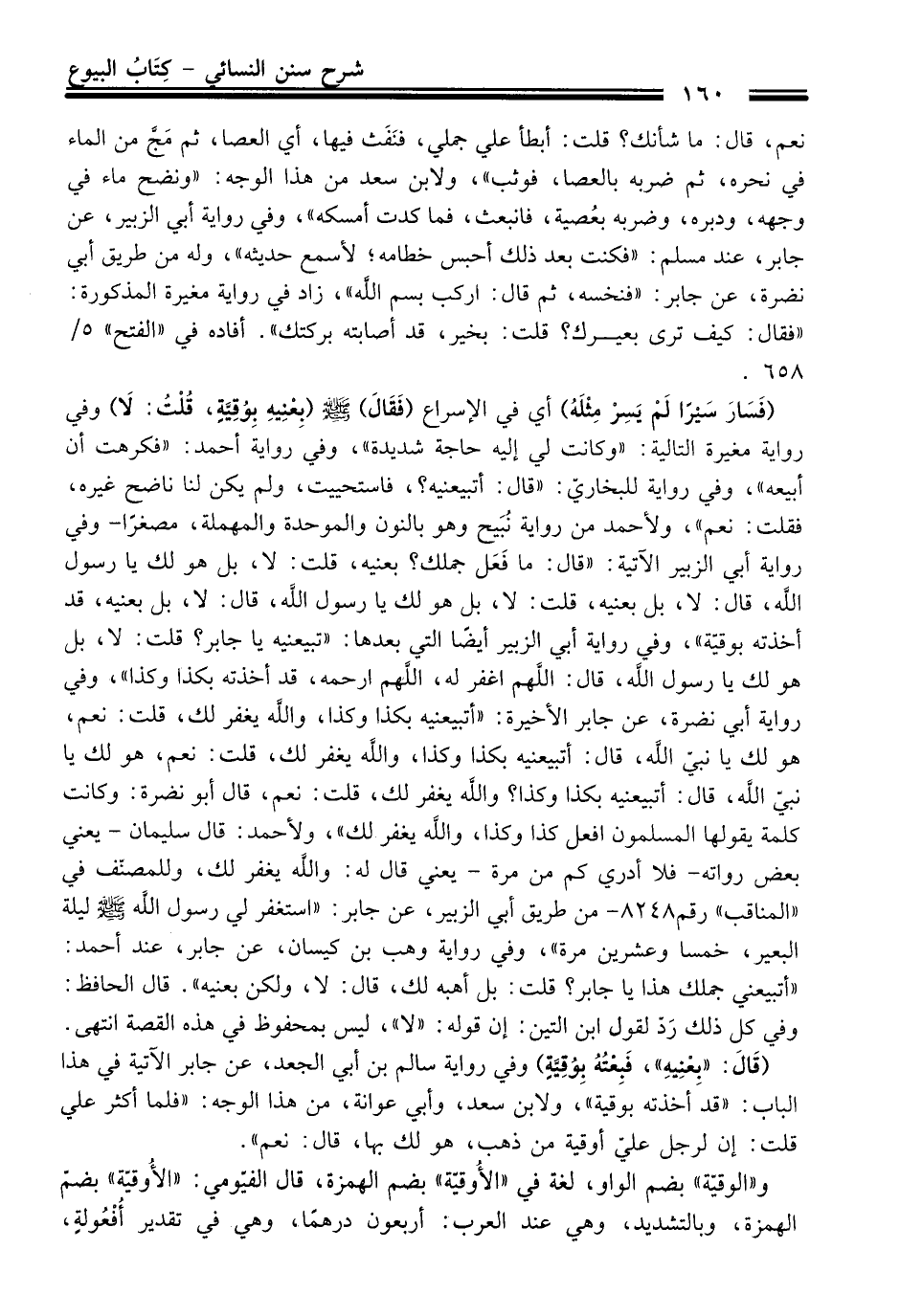 (قَالَ: "بِعْنِيهِ"، فَبِعْتُهُ بِوُقِيَّةٍ) وفي رواية سالم بن أبي الجعد، عن جابر الآتية فِي هَذَا الباب: "قد أخذته بوقية"، ولابن سعد، وأبي عوانة، منْ هَذَا الوجه: "فلما أكثر علي قلت: إن لرجل عليّ أوقية منْ ذهب، هو لك بها، قَالَ: نعم".