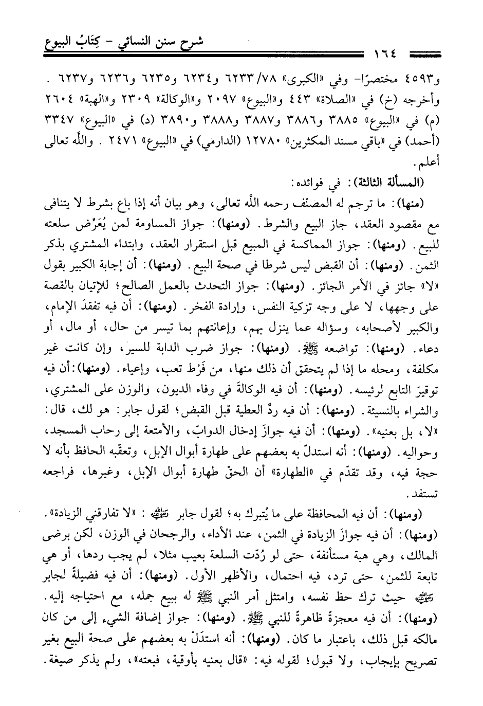 (منها): ما ترجم له المصنّف رحمه الله تعالى، وهو بيان أنه إذا باع بشرط لا يتنافى مع مقصود العقد، جاز البيع والشرط. (ومنها): جواز المساومة لمن يُعَرِّض سلعته للبيع. (ومنها): جواز المماكسة فِي المبيع قبل استقرار العقد، وابتداء المشتري بذكر الثمن. (ومنها): أن القبض ليس شرطا فِي صحة البيع. (ومنها): أن إجابة الكبير بقول "لا" جائز فِي الأمر الجائز. (ومنها): جواز التحدث بالعمل الصالح؛ للإتيان بالقصة عَلَى وجهها, لا عَلَى وجه تزكية النفس، وإرادة الفخر. (ومنها): أن فيه تفقدَ الإِمام، والكبير لأصحابه، وسؤاله عما ينزل بهم، وإعانتهم بما تيسر منْ حال، أو مال، أو دعاء. (ومنها): تواضعه -صلى الله عليه وسلم-. (ومنها): جواز ضرب الدابة للسير، وإن كانت غير مكلفة، ومحله ما إذا لم يتحقق أن ذلك منها، منْ فَرْط تعب، وإعياء. (ومنها): أن فيه توقيرَ التابع لرئيسه. (ومنها): أن فيه الوكالةَ فِي وفاء الديون، والوزن عَلَى المشتري، والشراء بالنسيئة. (ومنها): أن فيه ردَّ العطية قبل القبض؛ لقول جابر: هو لك، قَالَ: "لا، بل بعنيه". (ومنها): أن فيه جوازَ إدخال الدوابّ، والأمتعة إلى رحاب المسجد، وحواليه. (ومنها): أنه استدلّ به بعضهم عَلَى طهارة أبوال الإبل، وتعقّبه الحافظ بأنه لا حجة فيه، وَقَدْ تقدّم فِي "الطهارة" أن الحقّ طهارة أبوال الإبل، وغيرها، فراجعه تستفد.
