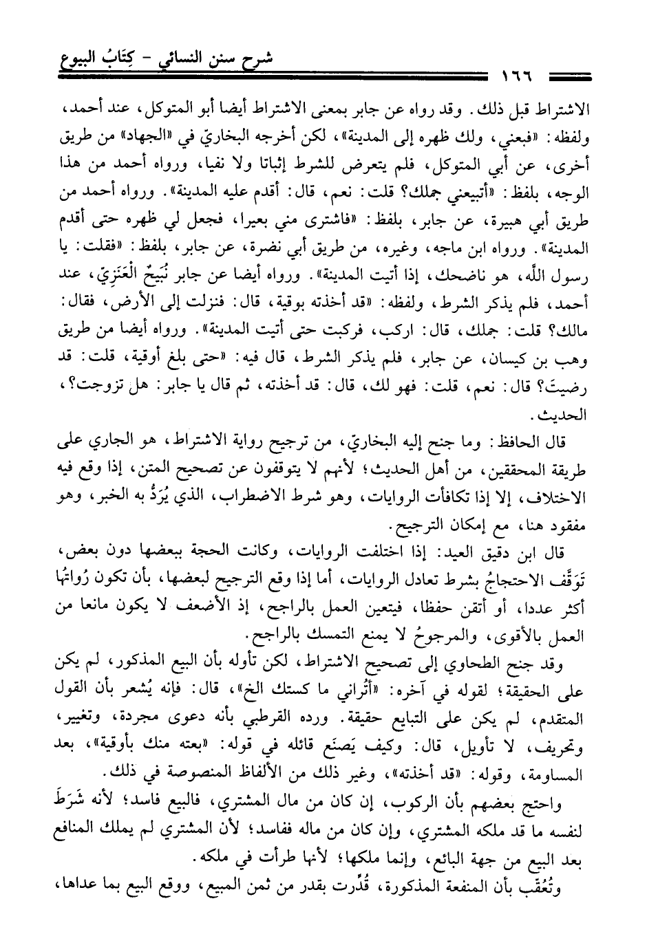 الاشتراط قبل ذلك. وَقَدْ رواه عن جابر بمعنى الاشتراط أيضا أبو المتوكل، عند أحمد، ولفظه: "فبعني، ولك ظهره إلى المدينة"، لكن أخرجه البخاريّ فِي "الجهاد" منْ طريق أخرى، عن أبي المتوكل، فلم يتعرض للشرط إثباتا ولا نفيا، ورواه أحمد منْ هَذَا الوجه، بلفظ: "أتبيعني جملك؟ قلت: نعم، قَالَ: أقدم عليه المدينة". ورواه أحمد منْ طريق أبي هبيرة، عن جابر، بلفظ: "فاشترى مني بعيرا، فجعل لي ظهره حَتَّى أقدم المدينة". ورواه ابن ماجه، وغيره، منْ طريق أبي نضرة، عن جابر، بلفظ: "فقلت: يا رسول الله، هو ناضحك، إذا أتيت المدينة". ورواه أيضا عن جابر نُبَيحٌ الْعَنَزِيّ، عند أحمد، فلم يذكر الشرط، ولفظه: "قد أخذته بوقية، قَالَ: فنزلت إلى الأرض، فَقَالَ: مالك؟ قلت: جملك، قَالَ: اركب، فركبت حَتَّى أتيت المدينة". ورواه أيضا منْ طريق وهب بن كيسان، عن جابر، فلم يذكر الشرط، قَالَ فيه: "حَتَّى بلغ أوقية، قلت: قد رضيتَ؟ قَالَ: نعم، قلت: فهو لك، قَالَ: قد أخذته، ثم قَالَ يا جابر: هل تزوجت؟، الْحَدِيث.