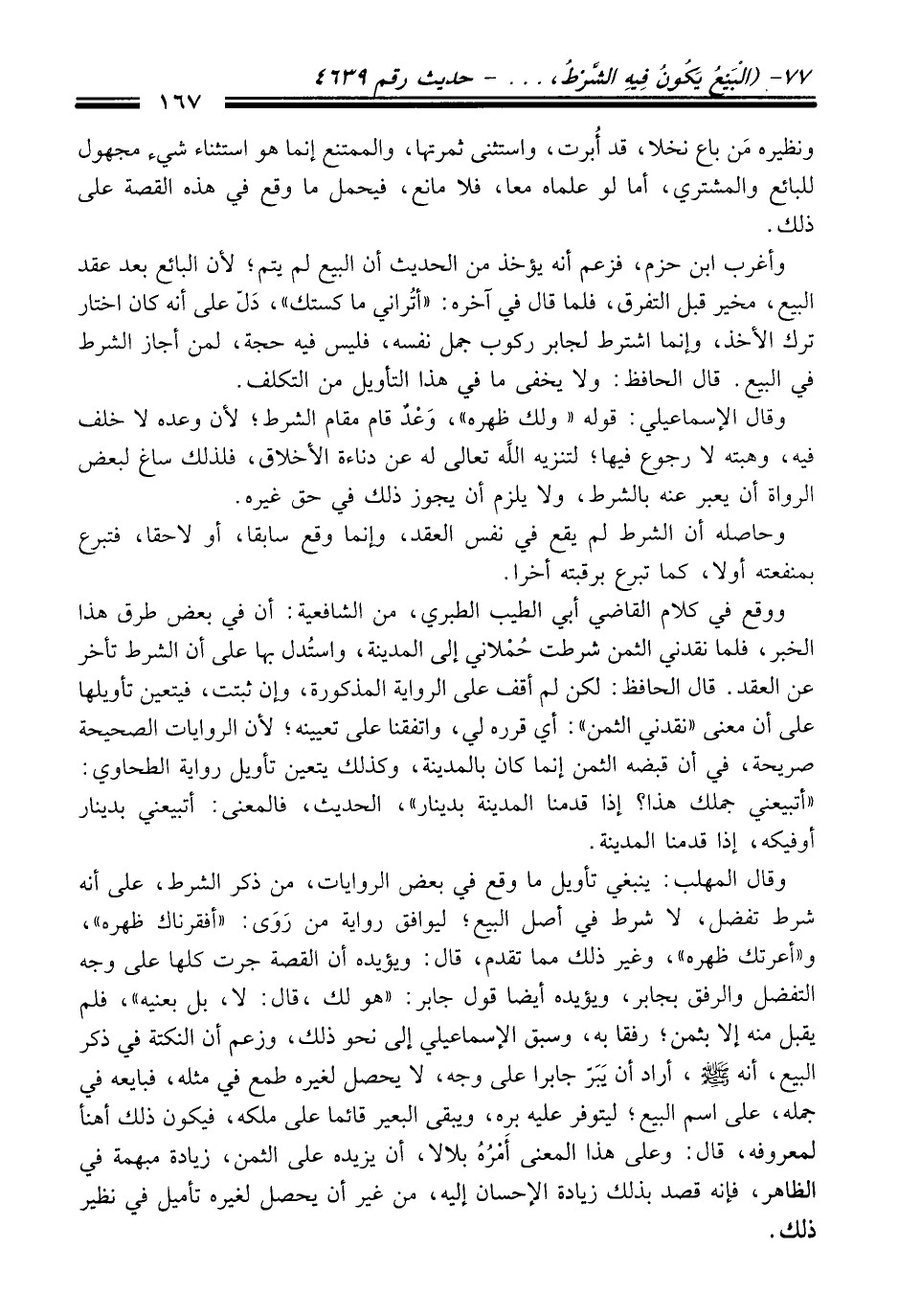 وأغرب ابن حزم، فزعم أنه يؤخذ منْ الْحَدِيث أن البيع لم يتم؛ لأن البائع بعد عقد البيع، غير قبل التفرق، فلما قَالَ فِي آخره: "أتُراني ما كستك"، دَلّ عَلَى أنه كَانَ اختار ترك الأخذ، وإنما اشترط لجابر ركوب جمل نفسه، فليس فيه حجة، لمن أجاز الشرط فِي البيع. قَالَ الحافظ: ولا يخفى ما فِي هَذَا التأويل منْ التكلف.