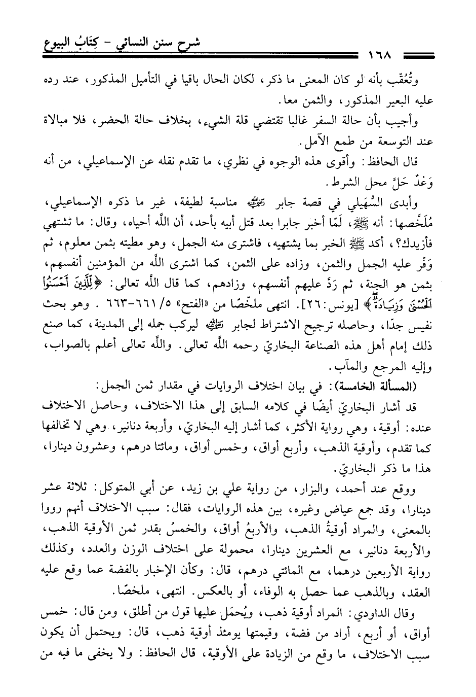 وأبدى السُّهَيلي فِي قصة جابر -رضي الله عنه- مناسبة لطيفة، غير ما ذكره الإسماعيلي، مُلَخَّصها: أنه -صلى الله عليه وسلم-، لَمّا أخبر جابرا بعد قتل أبيه بأحد، أن الله أحياه، وَقَالَ: ما تشتهي فأزيدك؟، أكد -صلى الله عليه وسلم- الخبر بما يشتهيه، فاشترى منه الجمل، وهو مطيته بثمن معلوم، ثم وَفّر عليه الجمل والثمن، وزاده عَلَى الثمن، كما اشترى الله منْ المؤمنين أنفسهم، بثمن هو الجنة، ثم رَدَّ عليهم أنفسهم، وزادهم، كما قَالَ الله تعالى: {لِلَّذِينَ أَحْسَنُوا الْحُسْنَى وَزِيَادَةٌ} [يونس: 26]. انتهى ملخّصًا منْ "الفتح" 5/ 661 - 663. وهو بحث نفيس جدًّا، وحاصله ترجيح الاشتراط لجابر -رضي الله عنه- ليركب جمله إلى المدينة، كما صنع ذلك إمام أهل هذه الصناعة البخاريّ رحمه الله تعالى. والله تعالى أعلم بالصواب، وإليه المرجع والمآب.