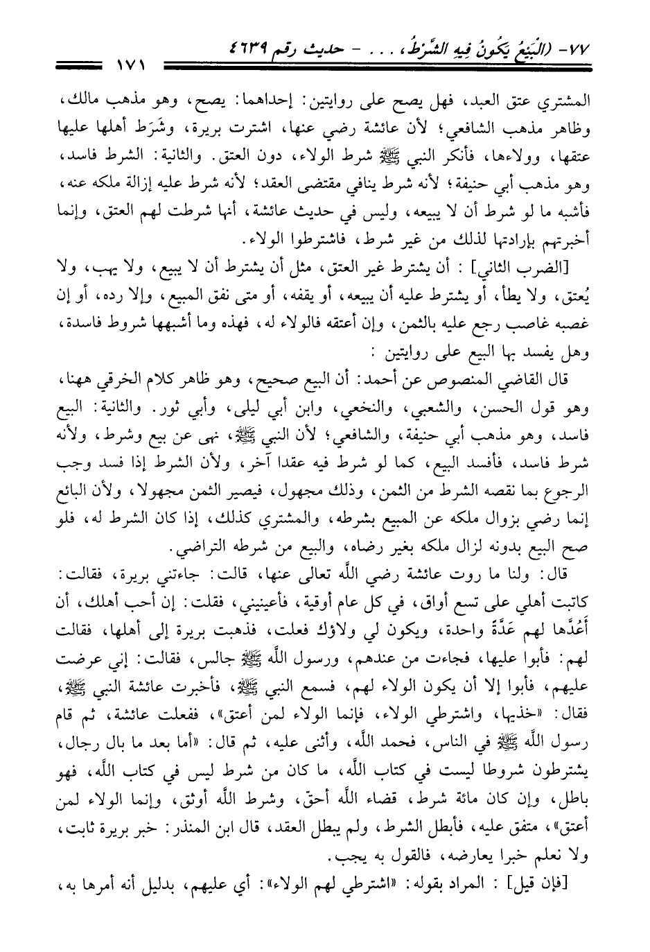 المشتري عتق العبد، فهل يصح عَلَى روايتين: إحداهما: يصح، وهو مذهب مالك، وظاهر مذهب الشافعيّ؛ لأن عائشة رضي الله عنها، اشترت بريرة، وشَرَط أهلها عليها عتقها، وولاءها، فأنكر النبيّ -صلى الله عليه وسلم- شرط الولاء، دون العتق. والثانية: الشرط فاسد، وهو مذهب أبي حنيفة؛ لأنه شرط ينافي مقتضى العقد؛ لأنه شرط عليه إزالة ملكه عنه، فأشبه ما لو شرط أن لا يبيعه، وليس فِي حديث عائشة، أنها شرطت لهم العتق، وإنما أخبرتهم بإرادتها لذلك منْ غير شرط، فاشترطوا الولاء.