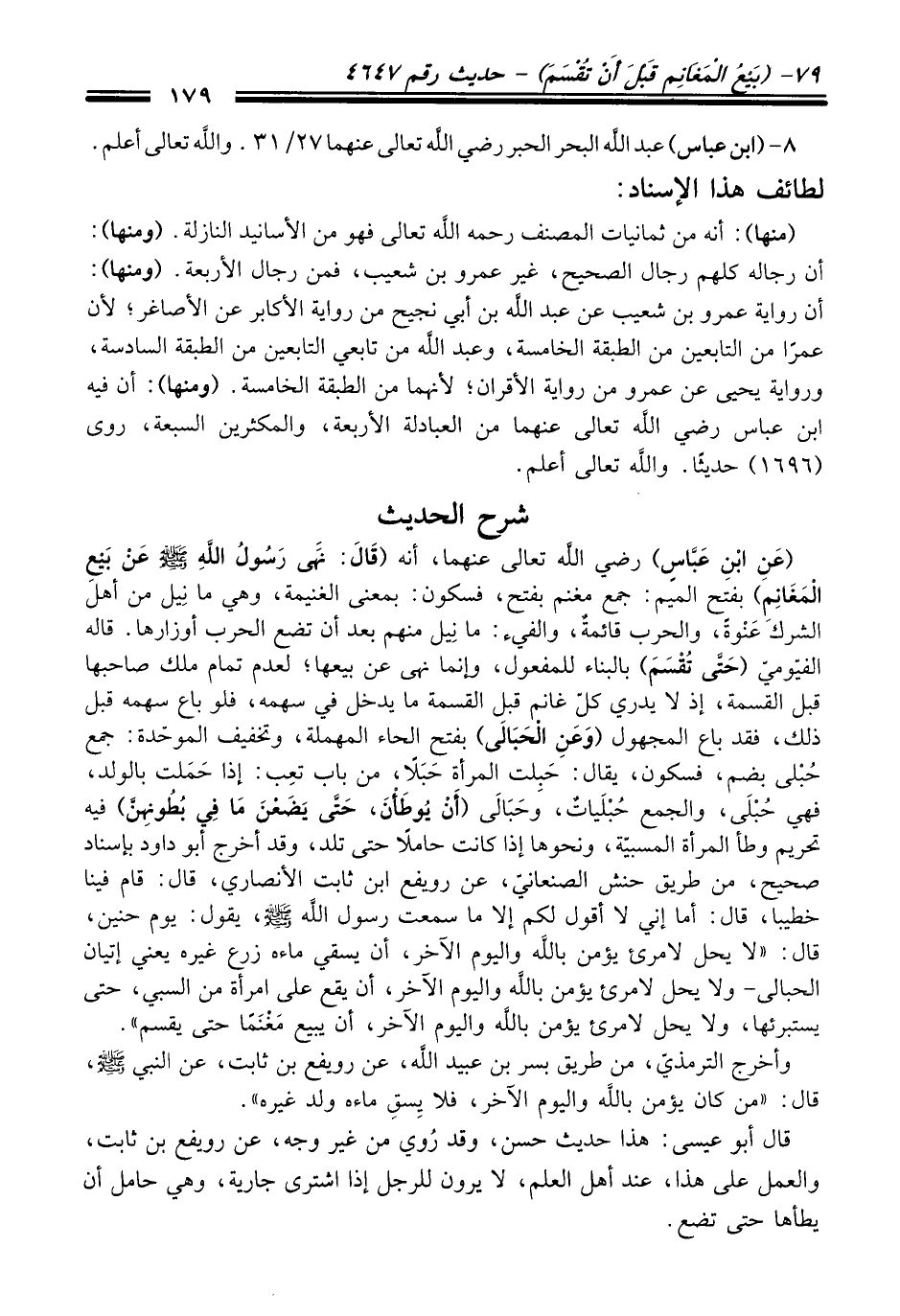 (عَنِ ابْنِ عَبَّاسٍ) رضي الله تعالى عنهما، أنه (قَالَ: نَهَى رَسُولُ اللهِ -صلى الله عليه وسلم- عَنْ بَيْعِ الْمَغَانِمِ) بفتح الميم: جمع مغنم بفتح، فسكون: بمعنى الغنيمة، وهي ما نِيل منْ أهل الشرك عَنْوةً، والحرب قائمةٌ، والفيء: ما نِيل منهم بعد أن تضع الحرب أوزارها. قاله الفيّوميّ (حَتَّى تُقْسَمَ) بالبناء للمفعول، وإنما نهى عن بيعها؛ لعدم تمام ملك صاحبها قبل القسمة، إذ لا يدري كلّ غانم قبل القسمة ما يدخل فِي سهمه، فلو باع سهمه قبل ذلك، فقد باع المجهول (وَعَنِ الْحَبَالَى) بفتح الحاء المهملة، وتخفيف الموحّدة: جمع حُبْلى بضم، فسكون، يقال: حَبِلت المرأة حَبَلاً، منْ باب تعِب: إذا حَمَلت بالولد، فهي حُبْلَى، والجمع حُبْلَياتٌ، وحَبَالَى (أَنْ يُوطَأْنَ، حَتَّى يَضَعْنَ مَا فِي بُطُونهِنَّ) فيه تحريم وطأ المرأة المسبيّة، ونحوها إذا كانت حاملاً حَتَّى تلد، وَقَدْ أخرج أبو داود بإسناد صحيح، منْ طريق حنش الصنعانيّ، عن رويفع ابن ثابت الأنصاريّ، قَالَ: قام فينا خطيبا، قَالَ: أما إني لا أقول لكم إلا ما سمعت رسول الله -صلى الله عليه وسلم-، يقول: يوم حنين، قَالَ: "لا يحل لامرىء يؤمن بالله واليوم الآخر، أن يسقي ماءه زرع غيره يعني إتيان الحبالى- ولا يحل لامرىء يؤمن بالله واليوم الآخر، أن يقع عَلَى امرأة منْ السبي، حَتَّى يستبرئها, ولا يحل لامرىء يؤمن بالله واليوم الآخر، أن يبيع مَغْنَمًا حَتَّى يقسم".