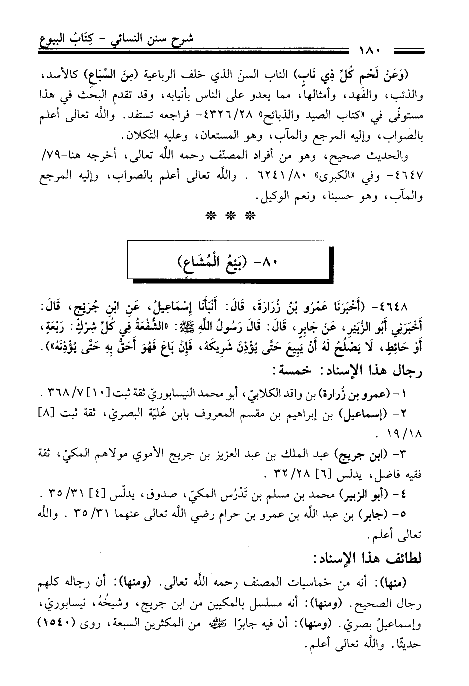 4648 - (أَخْبَرَنَا عَمْرُو بْنُ زُرَارَةَ، قَالَ: أَنْبَأَنَا إِسْمَاعِيلُ، عَنِ ابْنِ جُرَيْجٍ، قَالَ: أَخْبَرَنِي أَبُو الزُّبَيْرِ، عَنْ جَابِرٍ، قَالَ: قَالَ رَسُولُ اللَّهِ -صلى الله عليه وسلم-: "الشُّفْعَةُ فِي كُلِّ شِرْكٍ: رَبْعَةٍ، أَوْ حَائِطٍ، لاَ يَصْلُحُ لَهُ أَنْ يَبِيعَ حَتَّى يُؤْذِنَ شَرِيكَهُ، فَإِنْ بَاعَ فَهُوَ أَحَقُّ بِهِ حَتَّى يُؤْذِنَهُ").