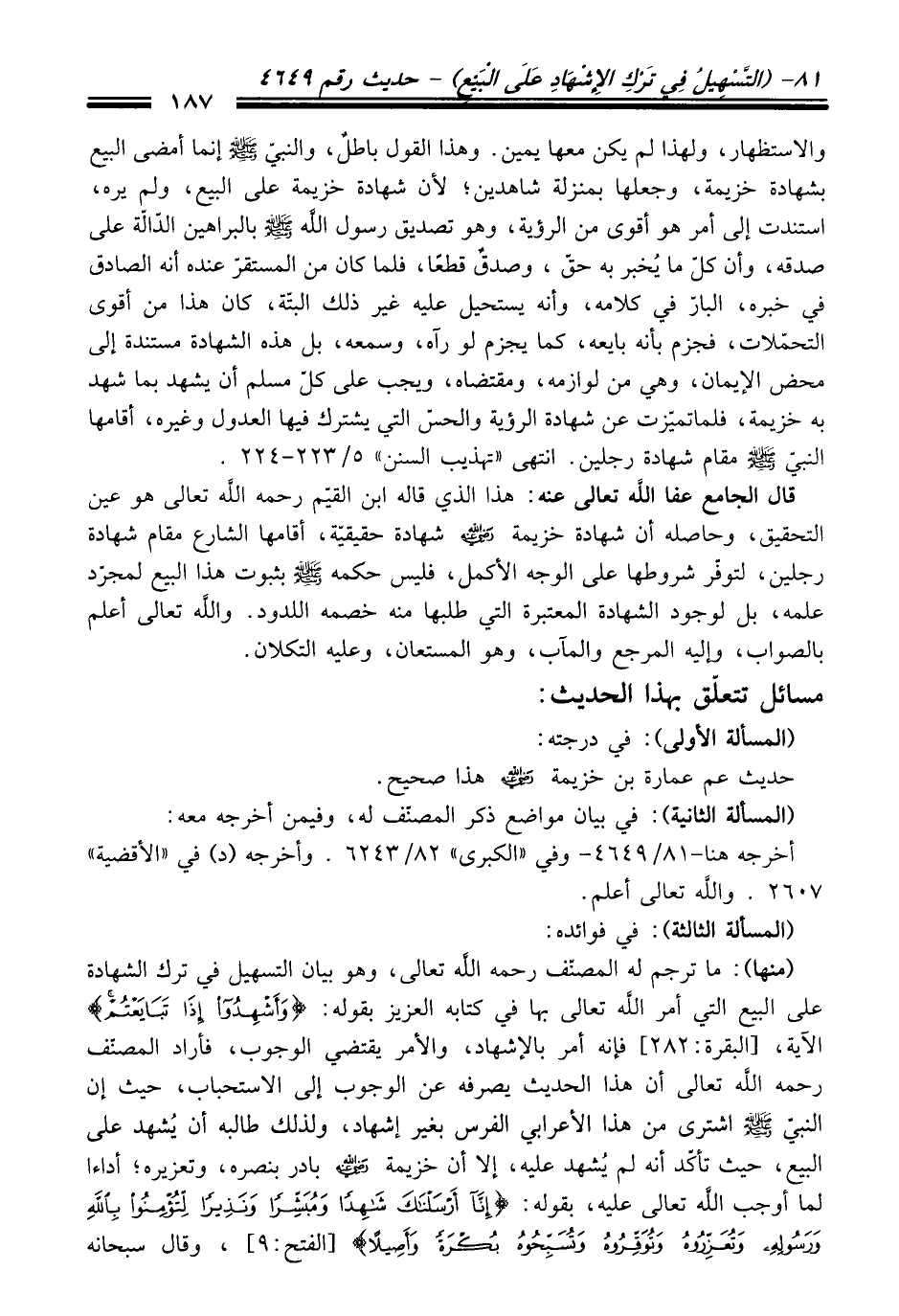 قَالَ الجامع عفا الله تعالى عنه: هَذَا الذي قاله ابن القيّم رحمه الله تعالى هو عين التحقيق، وحاصله أن شهادة خزيمة -رضي الله عنه- شهادة حقيقيّة، أقامها الشارع مقام شهادة رجلين، لتوفّر شروطها عَلَى الوجه الأكمل، فليس حكمه -صلى الله عليه وسلم- بثبوت هَذَا البيع لمجرّد علمه، بل لوجود الشهادة المعتبرة التي طلبها منه خصمه اللدود. والله تعالى أعلم بالصواب، وإليه المرجع والمآب، وهو المستعان، وعليه التكلان.