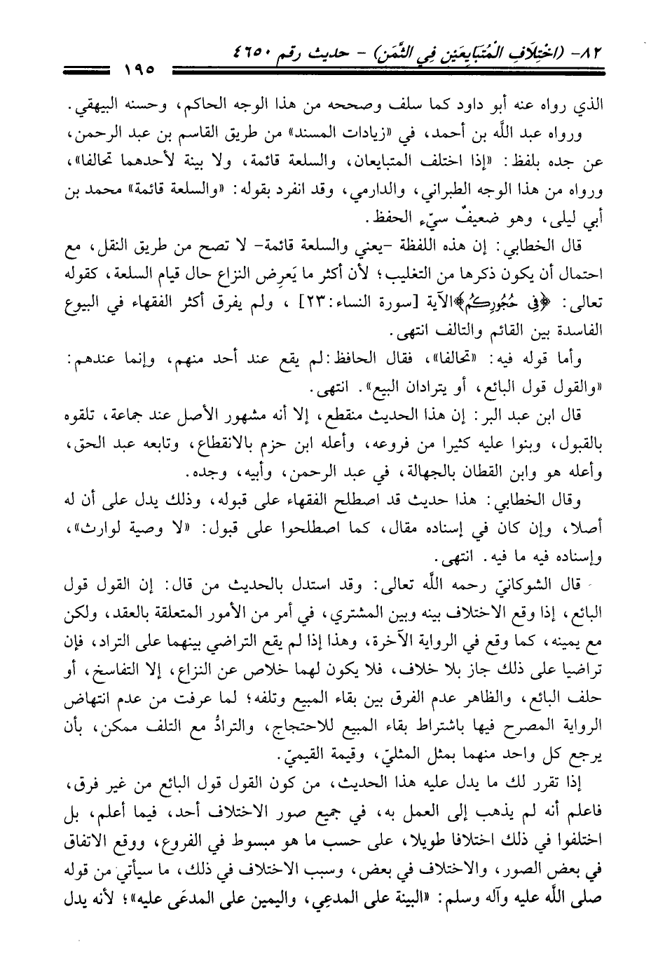 إذا تقرر لك ما يدل عليه هَذَا الْحَدِيث، منْ كون القول قول البائع منْ غير فرق، فاعلم أنه لم يذهب إلى العمل به، فِي جميع صور الاختلاف أحد، فيما أعلم، بل اختلفوا فِي ذلك اختلافا طويلا، عَلَى حسب ما هو مبسوط فِي الفروع، ووقع الاتفاق فِي بعض الصور، والاختلاف فِي بعض، وسبب الاختلاف فِي ذلك، ما سيأتي منْ قوله صلى الله عليه وآله وسلم: "البينة عَلَى المدعِي، واليمين عَلَى المدعَى عليه"؛ لأنه يدل