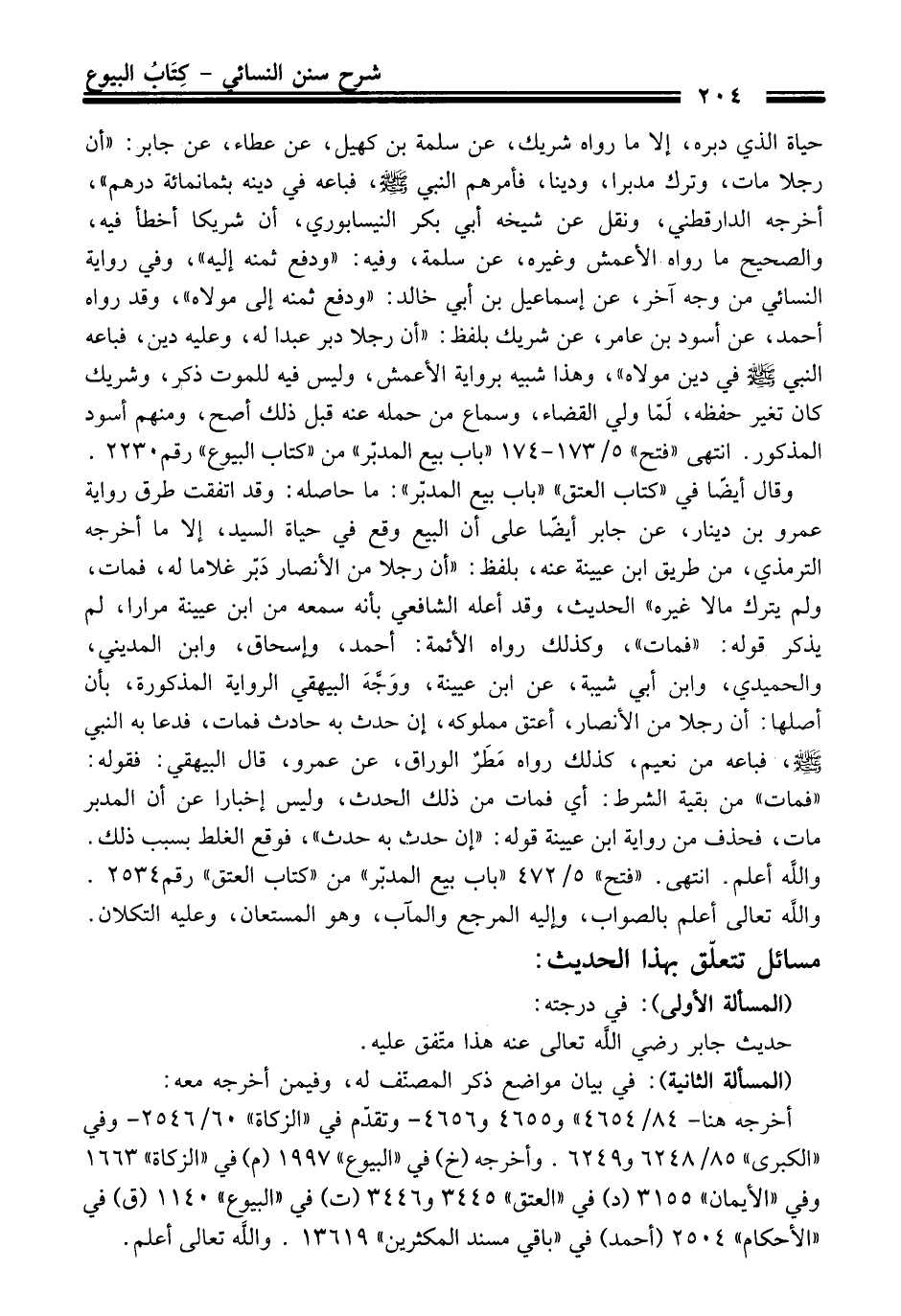وَقَالَ أيضًا فِي "كتاب العتق" "باب بيع المدبّر": ما حاصله: وَقَدْ اتفقت طرق رواية عمرو بن دينار، عن جابر أيضًا عَلَى أن البيع وقع فِي حياة السيد، إلا ما أخرجه الترمذيّ، منْ طريق ابن عيينة عنه، بلفظ: "أن رجلا منْ الأنصار دَبّر غلاما له، فمات، ولم يترك مالا غيره" الْحَدِيث، وَقَدْ أعله الشافعيّ بأنه سمعه منْ ابن عيينة مرارا، لم يذكر قوله: "فمات"، وكذلك رواه الأئمة: أحمد، وإسحاق، وابن المديني، والحميدي، وابن أبي شيبة، عن ابن عيينة، ووَجَّهَ البيهقي الرواية المذكورة، بأن أصلها: أن رجلا منْ الأنصار، أعتق مملوكه، إن حدث به حادث فمات، فدعا به النبيّ -صلى الله عليه وسلم-، فباعه منْ نعيم، كذلك رواه مَطَرٌ الوراق، عن عمرو، قَالَ البيهقي: فقوله: "فمات" منْ بقية الشرط: أي فمات منْ ذلك الحدث، وليس إخبارا عن أن المدبر مات، فحذف منْ رواية ابن عيينة قوله: "إن حدث به حدث"، فوقع الغلط بسبب ذلك. والله أعلم. انتهى. "فتح" 5/ 472 "باب بيع المدبّر" منْ "كتاب العتق" رقم 2534.