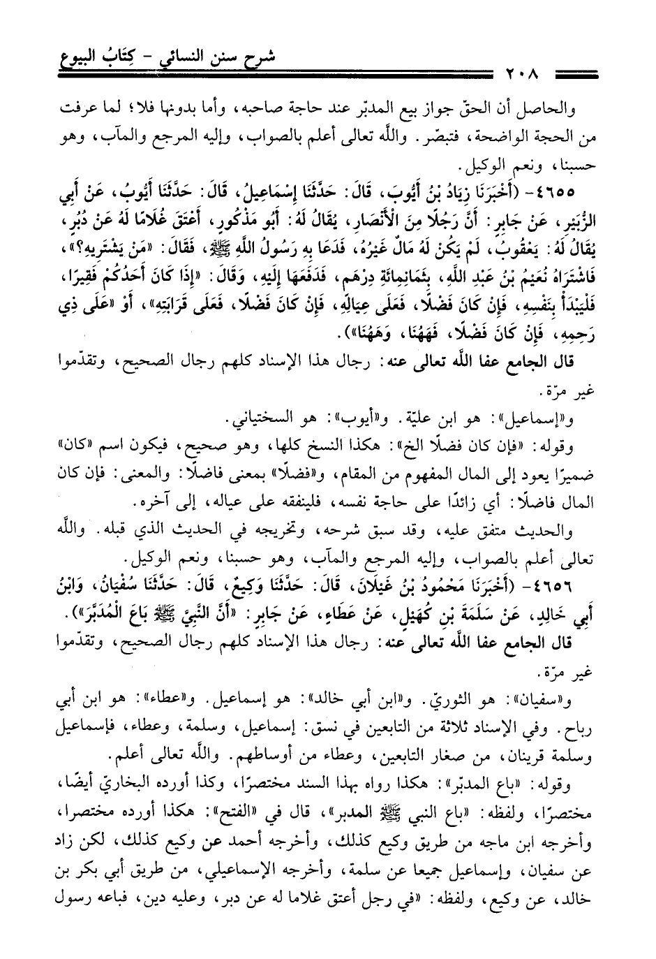 وقوله: "باع المدبّر": هكذا رواه بهذا السند مختصرًا، وكذا أورده البخاريّ أيضًا، مختصرًا, ولفظه: "باع النبيّ -صلى الله عليه وسلم- المدبر"، قَالَ فِي "الفتح": هكذا أورده مختصرا، وأخرجه ابن ماجه منْ طريق وكيع كذلك، وأخرجه أحمد عن وكيع كذلك، لكن زاد عن سفيان، وإسماعيل جميعا عن سلمة، وأخرجه الإسماعيلي، منْ طريق أبي بكر بن خالد، عن وكيع، ولفظه: "فِي رجل أعتق غلاما له عن دبر، وعليه دين، فباعه رسول