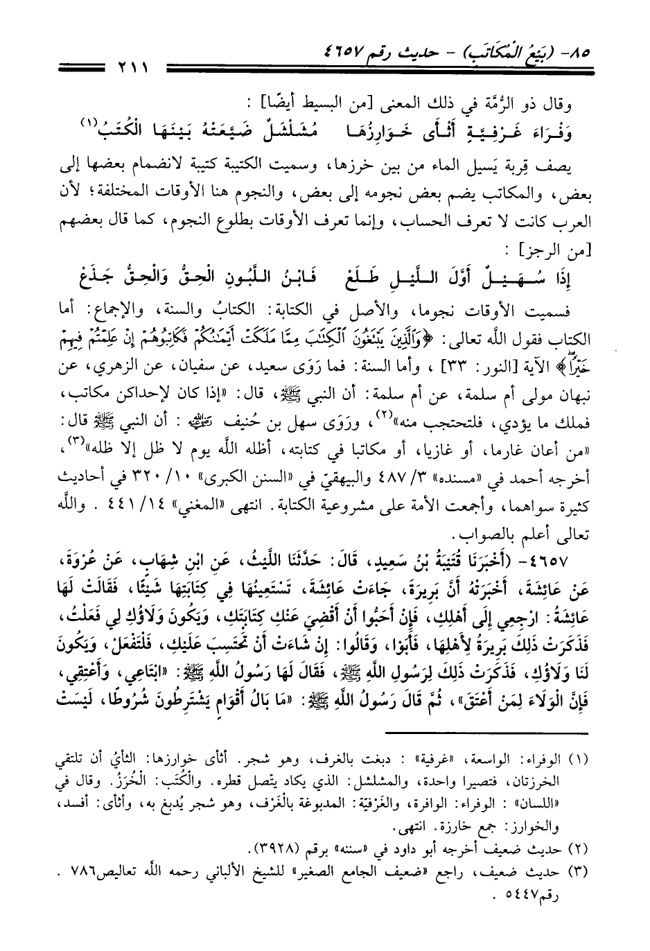 4657 - (أَخْبَرَنَا قُتَيْبَةُ بْنُ سَعِيدٍ، قَالَ: حَدَّثَنَا اللَّيْثُ، عَنِ ابْنِ شِهَابٍ، عَنْ عُرْوَةَ، عَنْ عَائِشَةَ، أَخْبَرَتْهُ أَنَّ بَرِيرَةَ، جَاءَتْ عَائِشَةَ، تَسْتَعِينُهَا فِي كِتَابَتِهَا شَيْئًا، فَقَالَتْ لَهَا عَائِشَةُ: ارْجِعِي إِلَى أَهْلِكِ، فَإِنْ أَحَبُّوا أَنْ أَقْضِيَ عَنْكِ كِتَابَتَكِ، وَيَكُونَ وَلاَؤُكِ لِي فَعَلْتُ، فَذَكَرَتْ ذَلِكَ بَرِيرَةُ لأَهْلِهَا، فَأَبَوْا، وَقَالُوا: إِنْ شَاءَتْ أَنْ تَحْتَسِبَ عَلَيْكِ، فَلْتَفْعَلْ، وَيَكُونَ لَنَا وَلاَؤُكِ، فَذَكَرَتْ ذَلِكَ لِرَسُولِ اللَّهِ -صلى الله عليه وسلم-، فَقَالَ لَهَا رَسُولُ اللَّهِ -صلى الله عليه وسلم-: "ابْتَاعِي، وَأَعْتِقِي، فَإِنَّ الْوَلاَءَ لِمَنْ أَعْتَقَ"، ثُمَّ قَالَ رَسُولُ اللَّهِ -صلى الله عليه وسلم-: "مَا بَالُ أَقْوَامٍ يَشْتَرِطُونَ شُرُوطًا، لَيْسَتْ