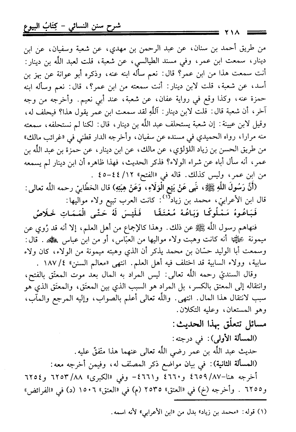 منْ طريق أحمد بن سنان، عن عبد الرحمن بن مهدي، عن شعبة وسفيان، عن ابن دينار، سمعت ابن عمر، وفي مسند الطيالسي، عن شعبة، قلت لعبد الله بن دينار: أنت سمعت هَذَا منْ ابن عمر؟ قَالَ: نعم سأله ابنه عنه، وذكره أبو عوانة عن بهز بن أسد، عن شعبة، قلت لابن دينار: أنت سمعته منْ ابن عمر؟، قَالَ: نعم وسأله ابنه حمزة عنه، وكذا وقع فِي رواية عفان، عن شعبة، عند أبي نعيم. وأخرجه منْ وجه آخر، أن شعبة قَالَ: قلت لابن دينار: آللَّهِ لقد سمعت ابن عمر يقول هَذَا؟ فيحلف له، وقيل لابن عيينة: إن شعبة يستحلف عبد الله بن دينار، قَالَ: لكنا لم نستحلفه، سمعته منه مرارا، رواه الحميدي فِي مسنده عن سفيان، وأخرجه الدارقطنيّ فِي "غرائب مالك" منْ طريق الحسن بن زياد اللؤلؤي، عن مالك، عن ابن دينار، عن حمزة بن عبد الله بن عمر، أنه سأل أباه عن شراء الولاء؟ فذكر الْحَدِيث، فهذا ظاهره أن ابن دينار لم يسمعه منْ ابن عمر، وليس كذلك. قاله فِي "الفتح" 12/ 44 - 45.
