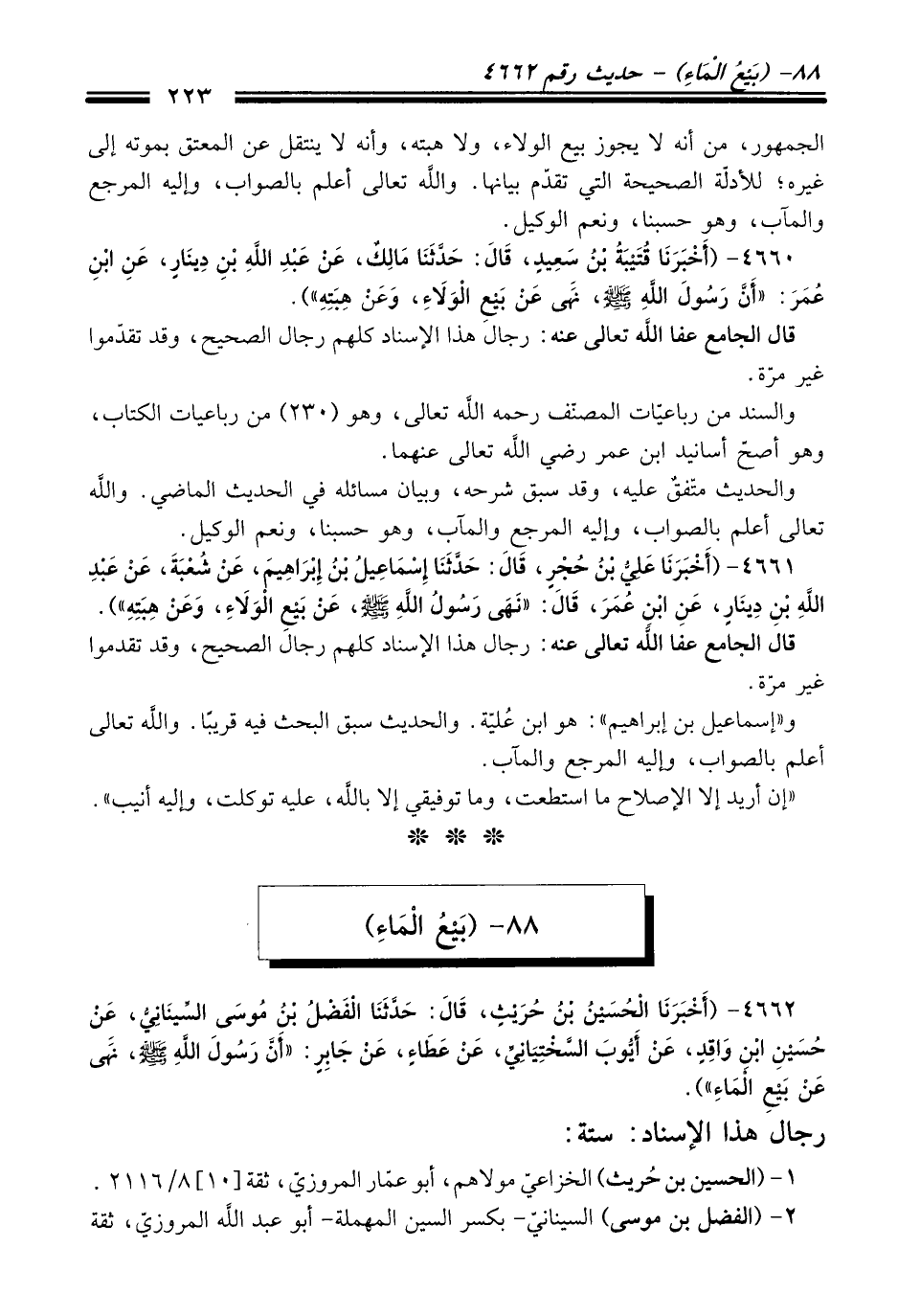 4662 - (أَخْبَرَنَا الْحُسَيْنُ بْنُ حُرَيْثٍ، قَالَ: حَدَّثَنَا الْفَضْلُ بْنُ مُوسَى السِّيْنَانِيُّ، عَنْ حُسَيْنِ بْنِ وَاقِدٍ، عَنْ أَيُّوبَ السَّخْتِيَانِيِّ، عَنْ عَطَاءٍ، عَنْ جَابِرٍ: "أَنَّ رَسُولَ اللَّهِ -صلى الله عليه وسلم-، نَهَى عَنْ بَيْعِ الْمَاءِ").