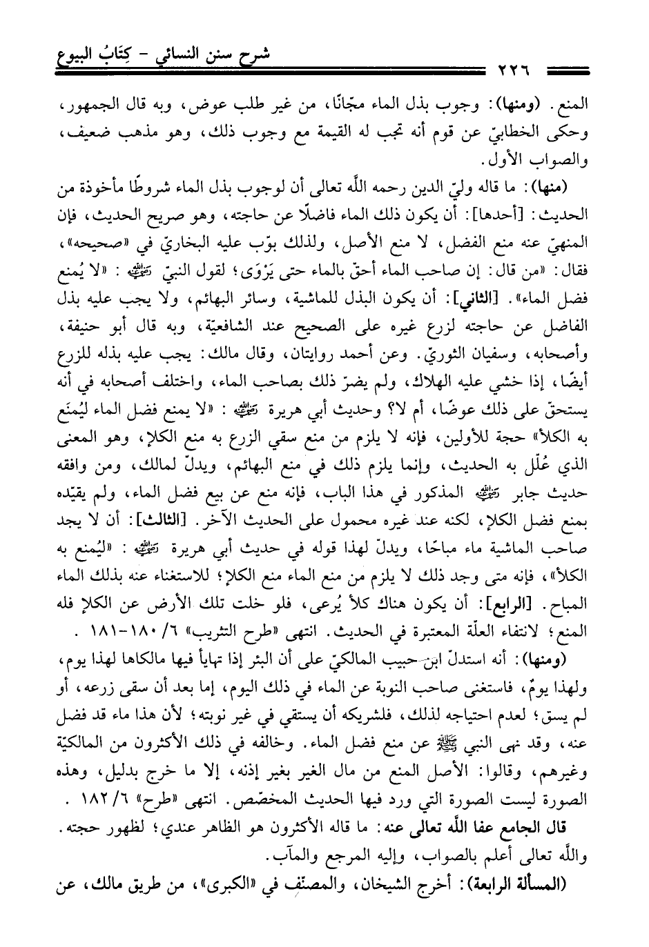 (منها): ما قاله وليّ الدين رحمه الله تعالى أن لوجوب بذل الماء شروطًا مأخوذة منْ الْحَدِيث: [أحدها]: أن يكون ذلك الماء فاضلاً عن حاجته، وهو صريح الْحَدِيث، فإن المنهيّ عنه منع الفضل، لا منع الأصل، ولذلك بوّب عليه البخاريّ فِي "صحيحه"، فَقَالَ: "منْ قَالَ: إن صاحب الماء أحقّ بالماء حَتَّى يَرْوَى؛ لقول النبيّ -صلى الله عليه وسلم-: "لا يُمنع فضل الماء". [الثاني]: أن يكون البذل للماشية، وسائر البهائم، ولا يجب عليه بذل الفاضل عن حاجته لزرع غيره عَلَى الصحيح عند الشافعيّة، وبه قَالَ أبو حنيفة، وأصحابه، وسفيان الثوريّ. وعن أحمد روايتان، وَقَالَ مالك: يجب عليه بذله للزرع أيضًا، إذا خشي عليه الهلاك، ولم يضرّ ذلك بصاحب الماء، واختلف أصحابه فِي أنه يستحقّ عَلَى ذلك عوضًا، أم لا؟ وحديث أبي هريرة -رضي الله عنه-: "لا يمنع فضل الماء ليُمنَع به الكلأ" حجة للأولين، فإنه لا يلزم منْ منع سقي الزرع به منع الكلإ، وهو المعنى الذي عُلّل به الْحَدِيث، وإنما يلزم ذلك فِي منع البهائم، ويدلّ لمالك، ومن وافقه حديث جابر -رضي الله عنه- المذكور فِي هَذَا الباب، فإنه منع عن بيع فضل الماء، ولم يقيّده بمنع فضل الكلإ، لكنه عند غيره محمول عَلَى الْحَدِيث الآخر. [الثالث]: أن لا يجد صاحب الماشية ماء مباحًا، ويدلّ لهذا قوله فِي حديث أبي هريرة -رضي الله عنه-: "ليُمنع به الكلأ"، فإنه متى وجد ذلك لا يلزم منْ منع الماء منع الكلإ؛ للاستغناء عنه بذلك الماء المباح. [الرابع]: أن يكون هناك كلأ يُرعى، فلو خلت تلك الأرض عن الكلإ فله المنع؛ لانتفاء العلّة المعتبرة فِي الْحَدِيث. انتهى "طرح التثريب" 6/ 180 - 181.