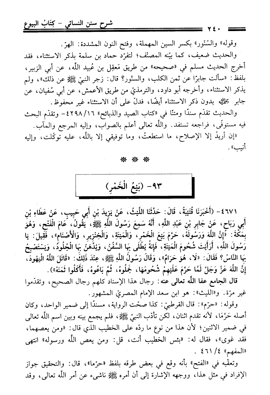 4671 - (أَخْبَرَنَا قُتَيْبَةُ، قَالَ: حَدَّثَنَا اللَّيْثُ، عَنْ يَزِيدَ بْنِ أَبِي حَبِيبٍ، عَنْ عَطَاءِ بْنِ أَبِي رَبَاحٍ، عَنْ جَابِرِ بْنِ عَبْدِ اللَّهِ، أَنَّهُ سَمِعَ رَسُولَ اللَّهِ -صلى الله عليه وسلم-، يَقُولُ، عَامَ الْفَتْحِ، وَهُوَ بِمَكَّةَ: "إِنَّ اللَّهَ وَرَسُولَهُ، حَرَّمَ بَيْعَ الْخَمْرِ، وَالْمَيْتَةِ، وَالْخِنْزِيرِ، وَالأَصْنَامِ"، فَقِيلَ: يَا رَسُولَ اللَّهِ، أَرَأَيْتَ شُحُومَ الْمَيْتَةِ، فَإِنَّهُ يُطْلَى بِهَا السُّفُنُ، وَيُدَّهَنُ بِهَا الْجُلُودُ، وَيَسْتَصْبِحُ بِهَا النَّاسُ؟ فَقَالَ: "لاَ هُوَ حَرَامٌ"، وَقَالَ رَسُولُ اللَّهِ -صلى الله عليه وسلم-، عِنْدَ ذَلِكَ: "قَاتَلَ اللَّهُ الْيَهُودَ، إِنَّ اللَّهَ عَزَّ وَجَلَّ لَمَّا حَرَّمَ عَلَيْهِمْ شُحُومَهَا، جَمَّلُوهُ، ثُمَّ بَاعُوهُ، فَأَكَلُوا ثَمَنَهُ").