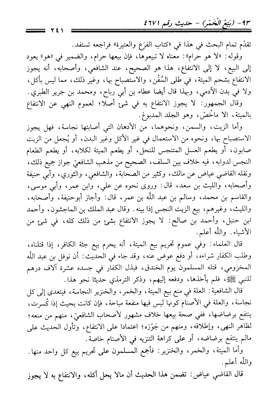 قَالَ العلماء: وفي عموم تحريم بيع الميتة، أنه يحرم بيع جثة الكافر، إذا قتلناه، وطلب الكفار شراءه، أو دفع عوض عنه، وَقَدْ جاء فِي الْحَدِيث: أن نوفل بن عبد الله المخزومي، قتله المسلمون يوم الخندق، فبذل الكفار فِي جسده عشرة آلاف درهم للنبي -صلى الله عليه وسلم-، فلم يأخذها، ودفعه إليهم، وذكر الترمذيّ حديثا نحو هَذَا.