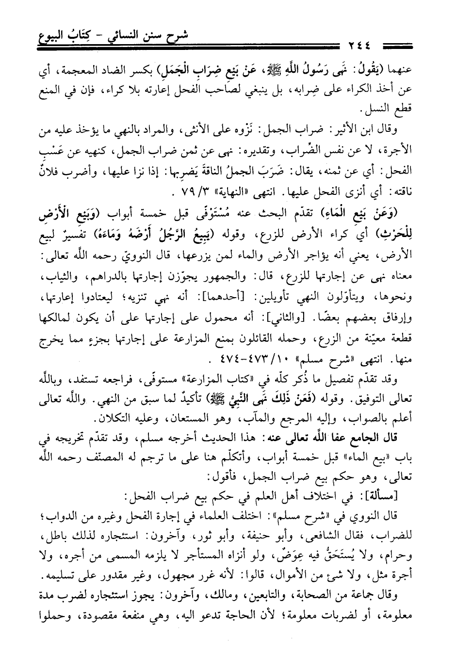 قَالَ الجامع عفا الله تعالى عنه: هَذَا الْحَدِيث أخرجه مسلم، وَقَدْ تقدّم تخريجه فِي باب "بيع الماء" قبل خمسة أبواب، وأتكلّم هنا عَلَى ما ترجم له المصنّف رحمه الله تعالى، وهو حكم بيع ضراب الجمل، فأقول:
