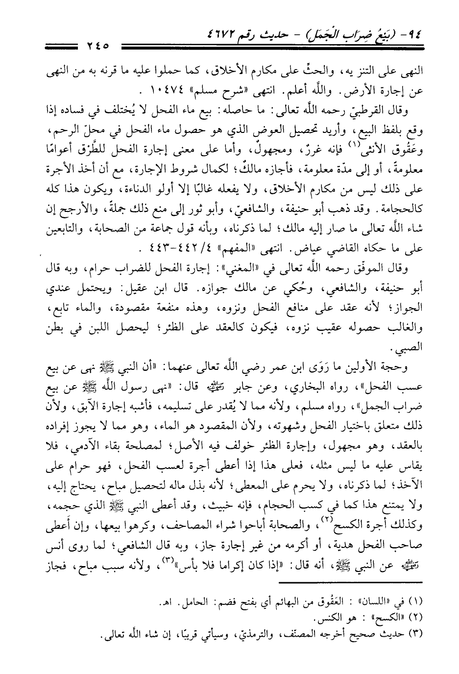 وَقَالَ القرطبيّ رحمه الله تعالى: ما حاصله: بيع ماء الفحل لا يُختلف فِي فساده إذا وقع بلفظ البيع، وأريد تحصيل العوض الذي هو حصول ماء الفحل فِي محلّ الرحم، وعَقُوق الأنثى (¬1) فإنه غررٌ، ومجهولٌ، وأما عَلَى معنى إجارة الفحل للطَّرْق أعوامًا معلومةً، أو إلى مدّة معلومة، فأجازه مالكٌ؛ لكمال شروط الإجارة، مع أن أخذ الأجرة عَلَى ذلك ليس منْ مكارم الأخلاق، ولا يفعله غالبًا إلا أولو الدناءة، ويكون هَذَا كله كالحجامة. وَقَدْ ذهب أبو حنيفة، والشافعيّ، وأبو ثور إلى منع ذلك جملةً، والأرجح إن شاء الله تعالى ما صار إليه مالك؛ لما ذكرناه، وبأنه قول جماعة منْ الصحابة، والتابعين عَلَى ما حكاه القاضي عياض. انتهى "المفهم" 4/ 442 - 443.