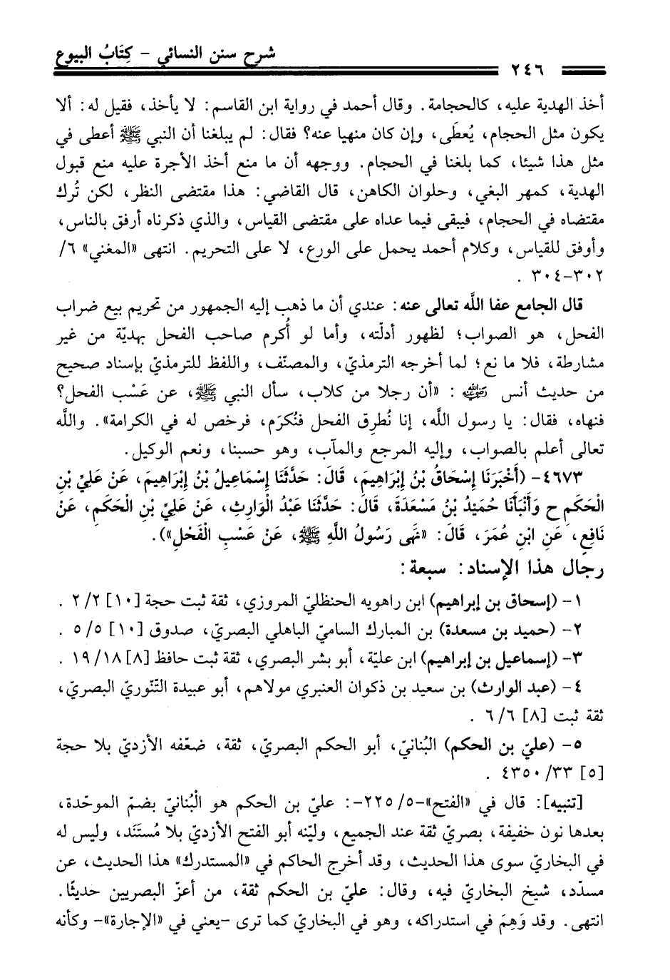4673 - (أَخْبَرَنَا إِسْحَاقُ بْنُ إِبْرَاهِيمَ، قَالَ: حَدَّثَنَا إِسْمَاعِيلُ بْنُ إِبْرَاهِيمَ، عَنْ عَلِيِّ بْنِ الْحَكَمِ ح وَأَنْبَأَنَا حُمَيْدُ بْنُ مَسْعَدَةَ، قَالَ: حَدَّثَنَا عَبْدُ الْوَارِثِ، عَنْ عَلِيِّ بْنِ الْحَكَمِ، عَنْ نَافِعٍ، عَنِ ابْنِ عُمَرَ، قَالَ: "نَهَى رَسُولُ اللَّهِ -صلى الله عليه وسلم- عَنْ عَسْبِ الْفَحْلِ").