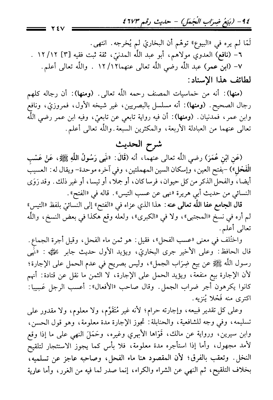 واختُلف فِي معنى "عسب الفحل"، فقيل: هو ثمن ماء الفحل، وقيل أجرة الجماعِ. قَالَ الحافظ: وعلى الأخير جرى البخاريّ، ويؤيد الأول حديث جابر -رضي الله عنه-: "نَهَى رسول الله -صلى الله عليه وسلم- عن بيع ضِرَاب الجمل"، وليس بصريح فِي عدم الحمل عَلَى الإجارة؛ لأن الإجارة بيع منفعة، ويؤيد الحمل عَلَى الإجارة، لا الثمن ما نقل عن قتادة: أنهم كانوا يكرهون أجر ضراب الجمل. وَقَالَ صاحب "الأفعال": أعسب الرجل عَسِيبا: اكترى منه فَحْلا يُنزيه.
