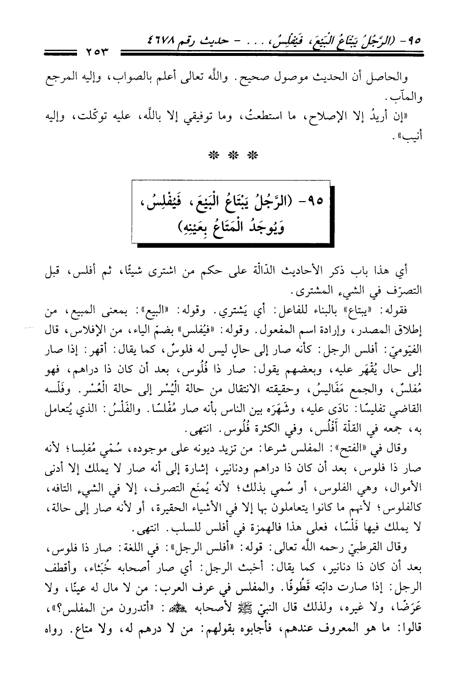 وَقَالَ فِي "الفتح": المفلس شرعا: منْ تزيد ديونه عَلَى موجوده، سُمّي مُفلِسا؛ لأنه صار ذا فلوس، بعد أن كَانَ ذا دراهم ودنانير، إشارة إلى أنه صار لا يملك إلا أدنى الأموال، وهي الفلوس، أو سُمي بذلك؛ لأنه يُمنَع التصرف، إلا فِي الشيء التافه، كالفلوس؛ لأنهم ما كانوا يتعاملون بها إلا فِي الأشياء الحقيرة، أو لأنه صار إلى حالة، لا يملك فيها فَلْسًا، فعلى هَذَا فالهمزة فِي أفلس للسلب. انتهى.