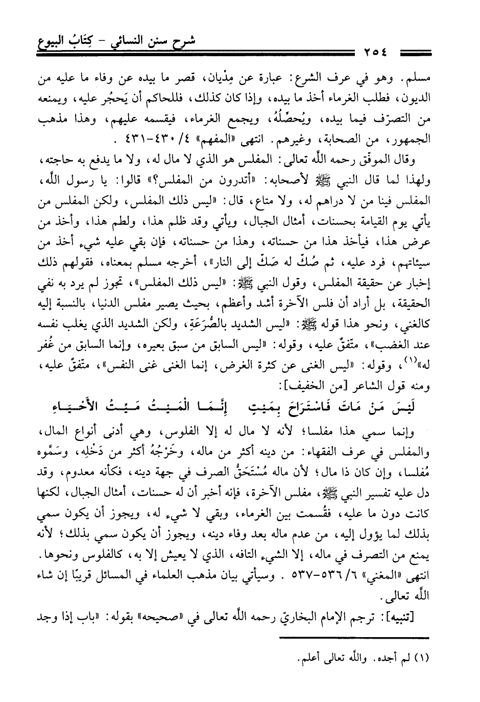 وَقَالَ الموفّق رحمه الله تعالى: المفلس هو الذي لا مال له، ولا ما يدفع به حاجته، ولهذا لما قَالَ النبيّ -صلى الله عليه وسلم- لأصحابه: "أتدرون منْ المفلس؟ " قالوا: يا رسول الله، المفلس فينا منْ لا دراهم له، ولا متاع، قَالَ: "ليس ذلك المفلس، ولكن المفلس منْ يأتي يوم القيامة بحسنات، أمثال الجبال، ويأتي وَقَدْ ظلم هَذَا, ولطم هَذَا، وأخذ منْ عرض هَذَا، فيأخذ هَذَا منْ حسناته، وهذا منْ حسناته، فإن بقي عليه شيء أخذ منْ سيئاتهم، فرد عليه، ثم صُكّ له صَكّ إلى النار"، أخرجه مسلم بمعناه، فقولهم ذلك إخبار عن حقيقة المفلس، وقول النبيّ -صلى الله عليه وسلم-: "ليس ذلك المفلس"، تجوز لم يرد به نفي الحقيقة، بل أراد أن فلس الآخرة أشد وأعظم، بحيث يصير مفلس الدنيا، بالنسبة إليه كالغني، ونحو هَذَا قوله -صلى الله عليه وسلم-: "ليس الشديد بالصُّرَعَةِ، ولكن الشديد الذي يغلب نفسه عند الغضب"، متّفقٌ عليه، وقوله: "ليس السابق منْ سبق بعيره، وإنما السابق منْ غُفر له" (¬1)، وقوله: "ليس الغنى عن كثرة الغرض، إنما الغنى غنى النفس"، متّفقٌ عليه، ومنه قول الشاعر [منْ الخفيف]: