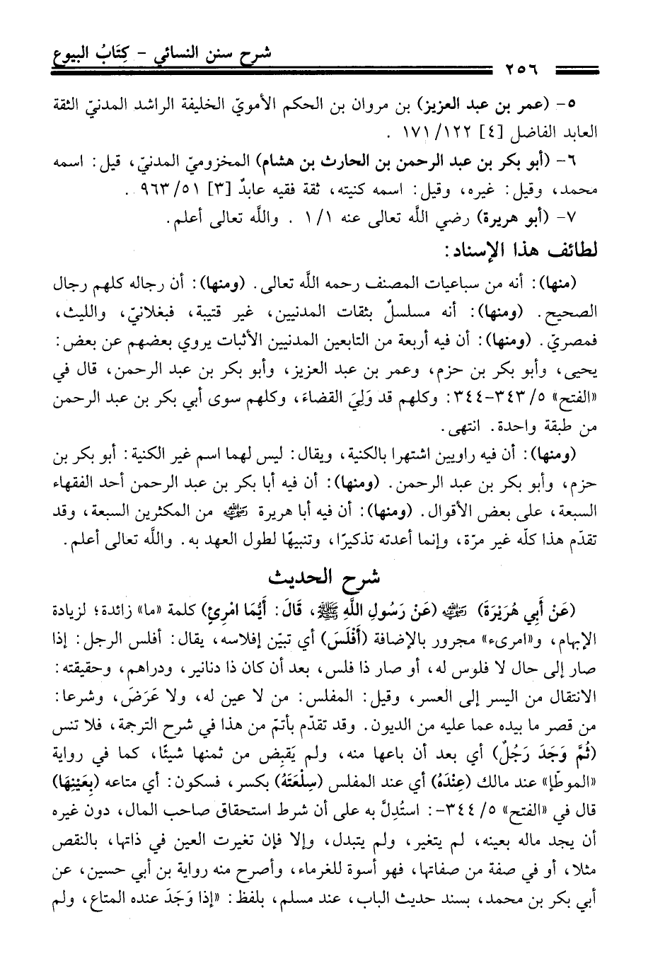 (عَنْ أَبِي هُرَيْرَةَ) -رضي الله عنه- (عَنْ رَسُولِ اللَّهِ -صلى الله عليه وسلم-، قَالَ: أَيُّمَا امْرِىءٍ) كلمة "ما" زائدة؛ لزيادة الإبهام، و"امرىء" مجرور بالإضافة (أَفْلَسَ) أي تبيّن إفلاسه، يقال: أفلس الرجل: إذا صار إلى حال لا فلوس له، أو صار ذا فلس، بعد أن كَانَ ذا دنانير، ودراهم، وحقيقته: الانتقال منْ اليسر إلى العسر، وقيل: المفلس: منْ لا عين له، ولا عَرَضَ، وشرعا: منْ قصر ما بيده عما عليه منْ الديون. وَقَدْ تقدّم بأتمّ منْ هَذَا فِي شرح الترجمة، فلا تنس (ثُمَّ وَجَدَ رَجُلٌ) أي بعد أن باعها منه، ولم يَقبِض منْ ثمنها شيئًا, كما فِي رواية "الموطّإ" عند مالك (عِنْدَهُ) أي عند المفلس (سِلْعَتَهُ) بكسر، فسكون: أي متاعه (بِعَيْنِهَا) قَالَ فِي "الفتح" 5/ 344 - : استُدِلَّ به عَلَى أن شرط استحقاق صاحب المال، دون غيره أن يجد ماله بعينه، لم يتغير، ولم يتبدل، وإلا فإن تغيرت العين فِي ذاتها، بالنقص مثلا، أو فِي صفة منْ صفاتها، فهو أسوة للغرماء، وأصرح منه رواية بن أبي حسين، عن أبي بكر بن محمد، بسند حديث الباب، عند مسلم، بلفظ: "إذا وَجَدَ عنده المتاع، ولم