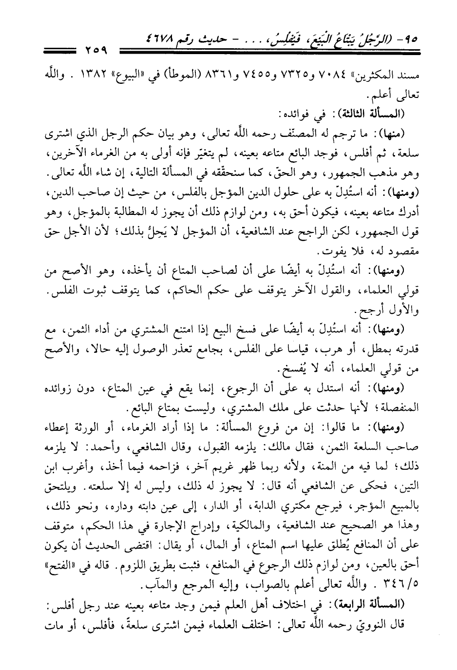 (منها): ما ترجم له المصنّف رحمه الله تعالى، وهو بيان حكم الرجل الذي اشترى سلعة، ثم أفلس، فوجد البائع متاعه بعينه، لم يتغيّر فإنه أولى به منْ الغرماء الآخرين، وهو مذهب الجمهور، وهو الحقّ، كما سنحقّقه فِي المسألة التالية، إن شاء الله تعالى. (ومنها): أنه استُدِلّ به عَلَى حلول الدين المؤجل بالفلس، منْ حيث إن صاحب الدين، أدرك متاعه بعينه، فيكون أحق به، ومن لوازم ذلك أن يجوز له المطالبة بالمؤجل، وهو قول الجمهور، لكن الراجح عند الشافعيّة، أن المؤجل لا يَحِلُّ بذلك؛ لأن الأجل حق مقصود له، فلا يفوت.