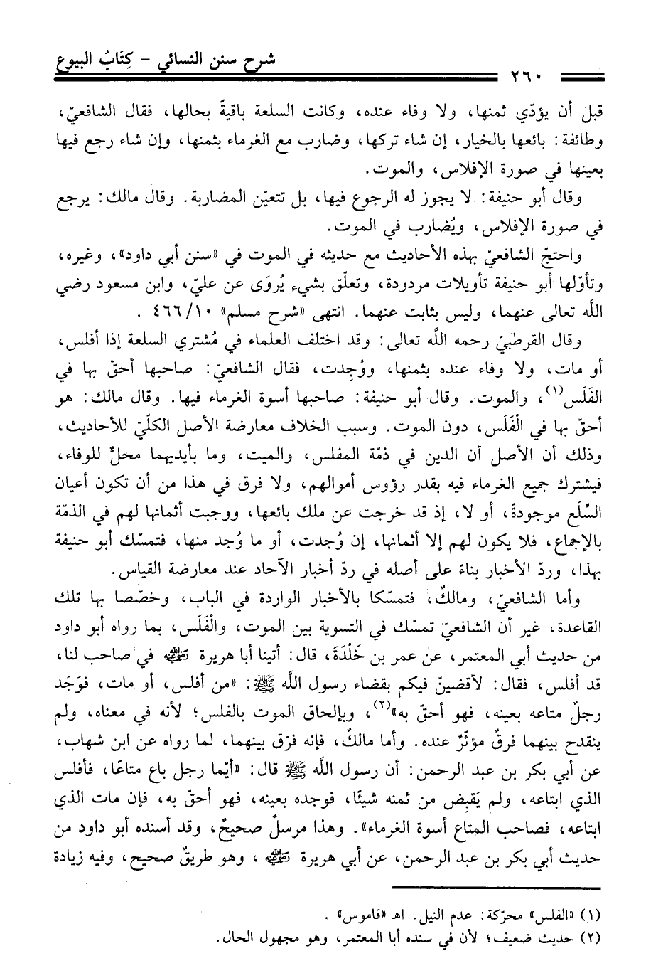 وأما الشافعيّ، ومالكٌ، فتمسّكا بالأخبار الواردة فِي الباب، وخصّصا بها تلك القاعدة، غير أن الشافعيّ تمسّك فِي التسوية بين الموت، والْفَلَس، بما رواه أبو داود منْ حديث أبي المعتمر، عن عمر بن خَلْدَةَ، قَالَ: أتينا أبا هريرة -رضي الله عنه- فِي صاحب لنا، قد أفلس، فَقَالَ: لأقضينّ فيكم بقضاء رسول الله -صلى الله عليه وسلم-: "منْ أفلس، أو مات، فوَجَد رجلٌ متاعه بعينه، فهو أحقّ به" (¬2)، وبإلحاق الموت بالفلس؛ لأنه فِي معناه، ولم ينقدح بينهما فرقٌ مؤثّرٌ عنده. وأما مالكٌ، فإنه فرّق بينهما، لما رواه عن ابن شهاب، عن أبي بكر بن عبد الرحمن: أن رسول الله -صلى الله عليه وسلم- قَالَ: "أيّما رجل باع متاعًا، فأفلس الذي ابتاعه، ولم يَقبِض منْ ثمنه شيئًا، فوجده بعينه، فهو أحقّ به، فإن مات الذي ابتاعه، فصاحب المتاع أسوة الغرماء". وهذا مرسلٌ صحيحٌ، وَقَدْ أسنده أبو داود منْ حديث أبي بكر بن عبد الرحمن، عن أبي هريرة -رضي الله عنه-، وهو طريقٌ صحيح، وفيه زيادة