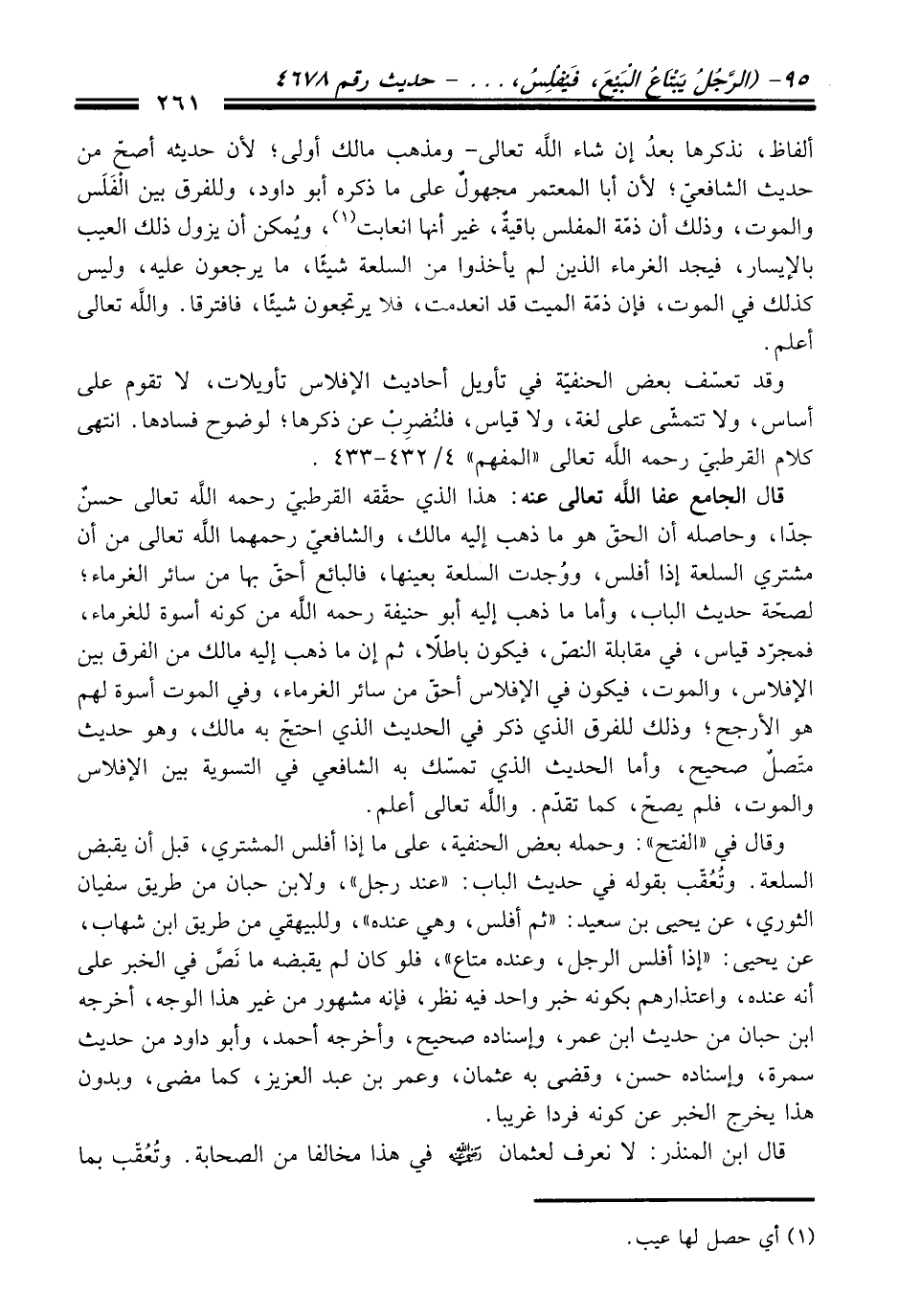 قَالَ الجامع عفا الله تعالى عنه: هَذَا الذي حقّقه القرطبيّ رحمه الله تعالى حسنٌ جدًّا، وحاصله أن الحقّ هو ما ذهب إليه مالك، والشافعيّ رحمهما الله تعالى منْ أن مشتري السلعة إذا أفلس، ووُجدت السلعة بعينها، فالبائع أحقّ بها منْ سائر الغرماء؛ لصحّة حديث الباب، وأما ما ذهب إليه أبو حنيفة رحمه الله منْ كونه أسوة للغرماء، فمجرّد قياس، فِي مقابلة النصّ، فيكون باطلاً، ثم إن ما ذهب إليه مالك منْ الفرق بين الإفلاس، والموت، فيكون فِي الإفلاس أحقّ منْ سائر الغرماء، وفي الموت أسوة لهم هو الأرجح؛ وذلك للفرق الذي ذكر فِي الْحَدِيث الذي احتجّ به مالك، وهو حديث متّصلٌ صحيح، وأما الْحَدِيث الذي تمسّك به الشافعيّ فِي التسوية بين الإفلاس والموت، فلم يصحّ، كما تقدّم. والله تعالى أعلم.
