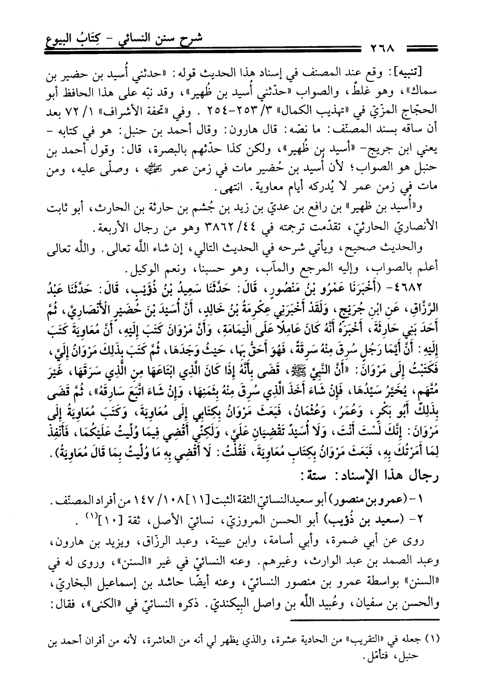 [تنبيه]: وقع عند المصنّف فِي إسناد هَذَا الْحَدِيث قوله: "حدثني أُسيد بن حضير بن سماك"، وهو غلطٌ، والصواب "حدّثني أُسيد بن ظُهير"، وَقَدْ نبّه عَلَى هَذَا الحافظ أبو الحجّاج المزّيّ فِي "تهذيب الكمال" 3/ 253 - 254. وفي "تحفة الأشراف" 1/ 72 بعد أن ساقه بسند المصنّف: ما نصّه: قَالَ هارون: وَقَالَ أحمد بن حنبل: هو فِي كتابه -يعني ابن جريج- "أسيد بن ظُهير"، ولكن كذا حدّثهم بالبصرة، قَالَ: وقول أحمد بن حنبل هو الصواب؛ لأن أُسيد بن حُضير مات فِي زمن عمر -رضي الله عنه-، وصلّى عليه، ومن مات فِي زمن عمر لا يُدركه أيام معاوية. انتهى.