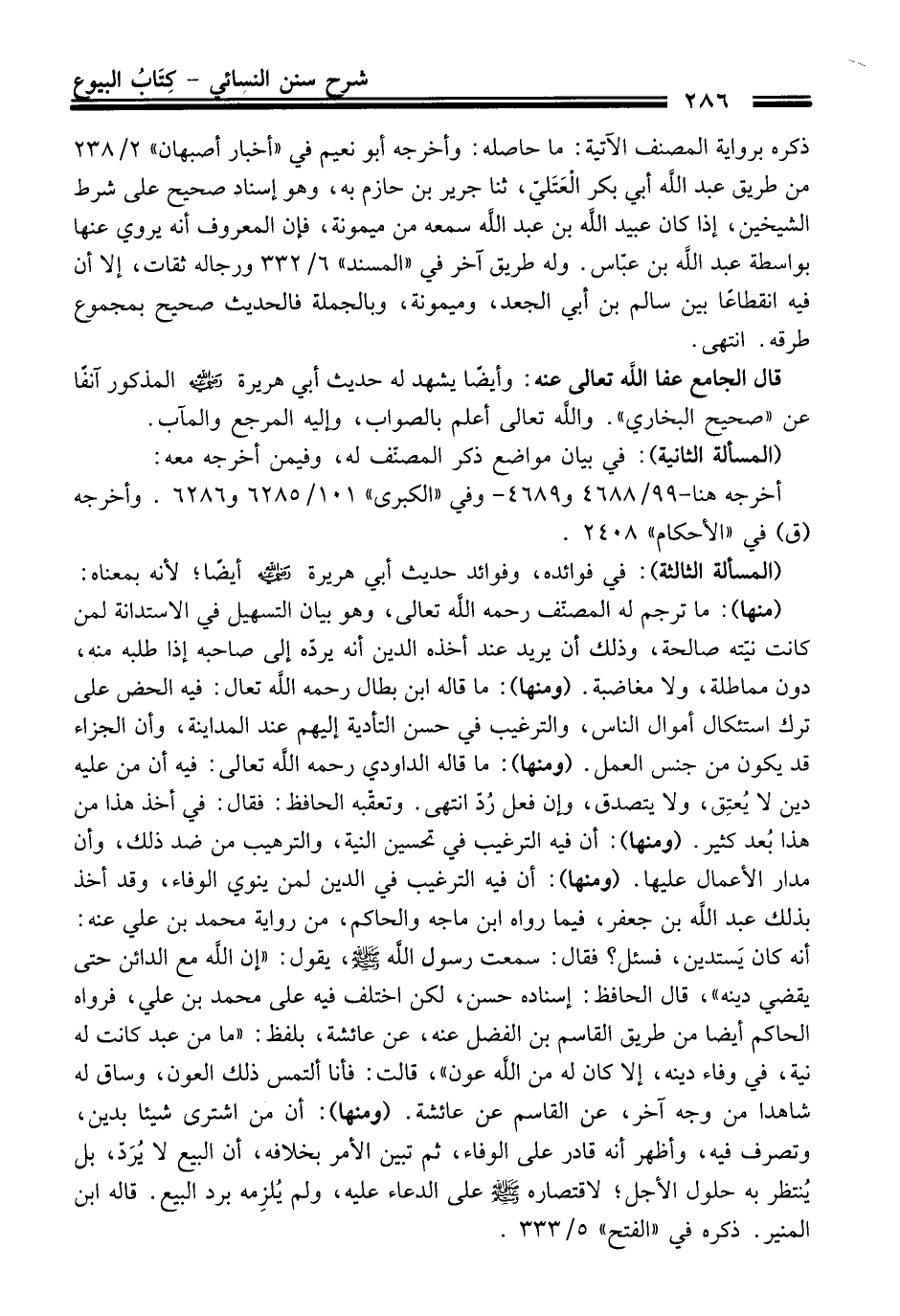 (منها): ما ترجم له المصنّف رحمه الله تعالى، وهو بيان التسهيل فِي الاستدانة لمن كانت نيّته صالحة، وذلك أن يريد عند أخذه الدين أنه يردّه إلى صاحبه إذا طلبه منه، دون مماطلة، ولا مغاضبة. (ومنها): ما قاله ابن بطال رحمه الله تعال: فيه الحض عَلَى ترك استئكال أموال النَّاس، والترغيب فِي حسن التأدية إليهم عند المداينة، وأن الجزاء قد يكون منْ جنس العمل. (ومنها): ما قاله الداودي رحمه الله تعالى: فيه أن منْ عليه دين لا يُعتِق، ولا يتصدق، وإن فعل رُدّ انتهى. وتعقّبه الحافظ: فَقَالَ: فِي أخذ هَذَا منْ هَذَا بُعد كثير. (ومنها): أن فيه الترغيب فِي تحسين النية، والترهيب منْ ضد ذلك، وأن مدار الأعمال عليها. (ومنها): أن فيه الترغيب فِي الدين لمن ينوي الوفاء، وَقَدْ أخذ بذلك عبد الله بن جعفر، فيما رواه ابن ماجه والحاكم، منْ رواية محمد بن علي عنه: أنه كَانَ يَستدين، فسئل؟ فَقَالَ: سمعت رسول الله -صلى الله عليه وسلم-، يقول: "إن الله مع الدائن حَتَّى يقضي دينه"، قَالَ الحافظ: إسناده حسن، لكن اختلف فيه عَلَى محمد بن علي، فرواه الحاكم أيضا منْ طريق القاسم بن الفضل عنه، عن عائشة، بلفظ: "ما منْ عبد كانت له نية، فِي وفاء دينه، إلا كَانَ له منْ الله عون"، قالت: فأنا ألتمس ذلك العون، وساق له شاهدا منْ وجه آخر، عن القاسم عن عائشة. (ومنها): أن منْ اشترى شيئا بدين، وتصرف فيه، وأظهر أنه قادر عَلَى الوفاء، ثم تبين الأمر بخلافه، أن البيع لا يُرَدّ، بل يُنتظر به حلول الأجل؛ لاقتصاره -صلى الله عليه وسلم- عَلَى الدعاء عليه، ولم يُلزِمه برد البيع. قاله ابن المنير. ذكره فِي "الفتح" 5/ 333.
