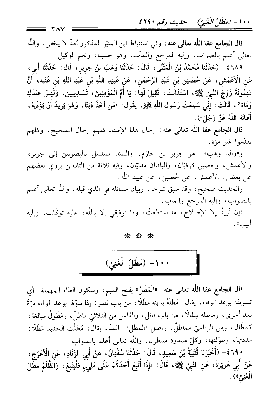 قَالَ الجامع عفا الله تعالى عنه: "الْمَطْلُ" بفتح الميم، وسكون الطاء المهملة: أي تسويفه بوعد الوفاء، يقال: مَطَلَهُ بدينه مَطْلاً، منْ باب نصر: إذا سوّفه بوعد الوفاء مرّةً بعد أخرى، وماطله مِطالاً، منْ باب قاتل، والفاعل منْ الثلاثيّ ماطلٌ، ومَطُولٌ مبالغة، كمطّال، ومن الرباعيّ مماطلٌ. وأصل "المطل": المدّ، يقال: مَطَلْت الحديدَ مَطْلاً: مددتها، وطوّلتها، وكلّ ممدود ممطول. والله تعالى أعلم بالصواب.
