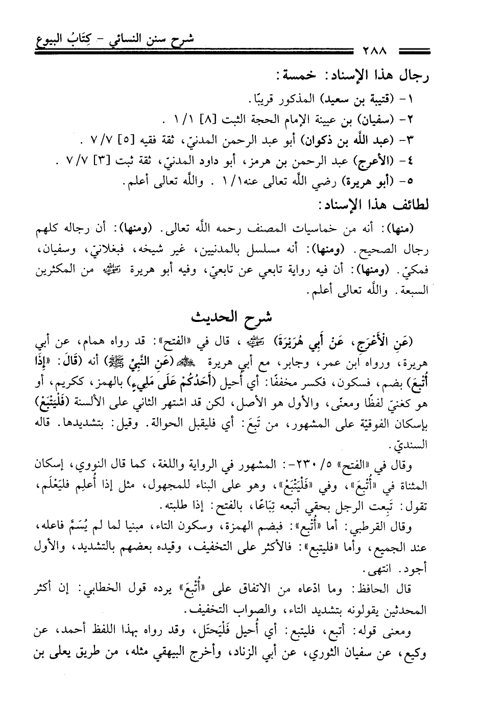 وَقَالَ فِي "الفتح" 5/ 230 - : المشهور فِي الرواية واللغة، كما قَالَ النوويّ، إسكان المثناة فِي "أُتْبعَ"، وفي "فَلْيَتْبَعْ"، وهو عَلَى البناء للمجهول، مثل إذا أُعلِم فليَعْلَم، تقول: تَبِعت الرجل بحقي أتبعه تِبَاعًا، بالفتح: إذا طلبته.