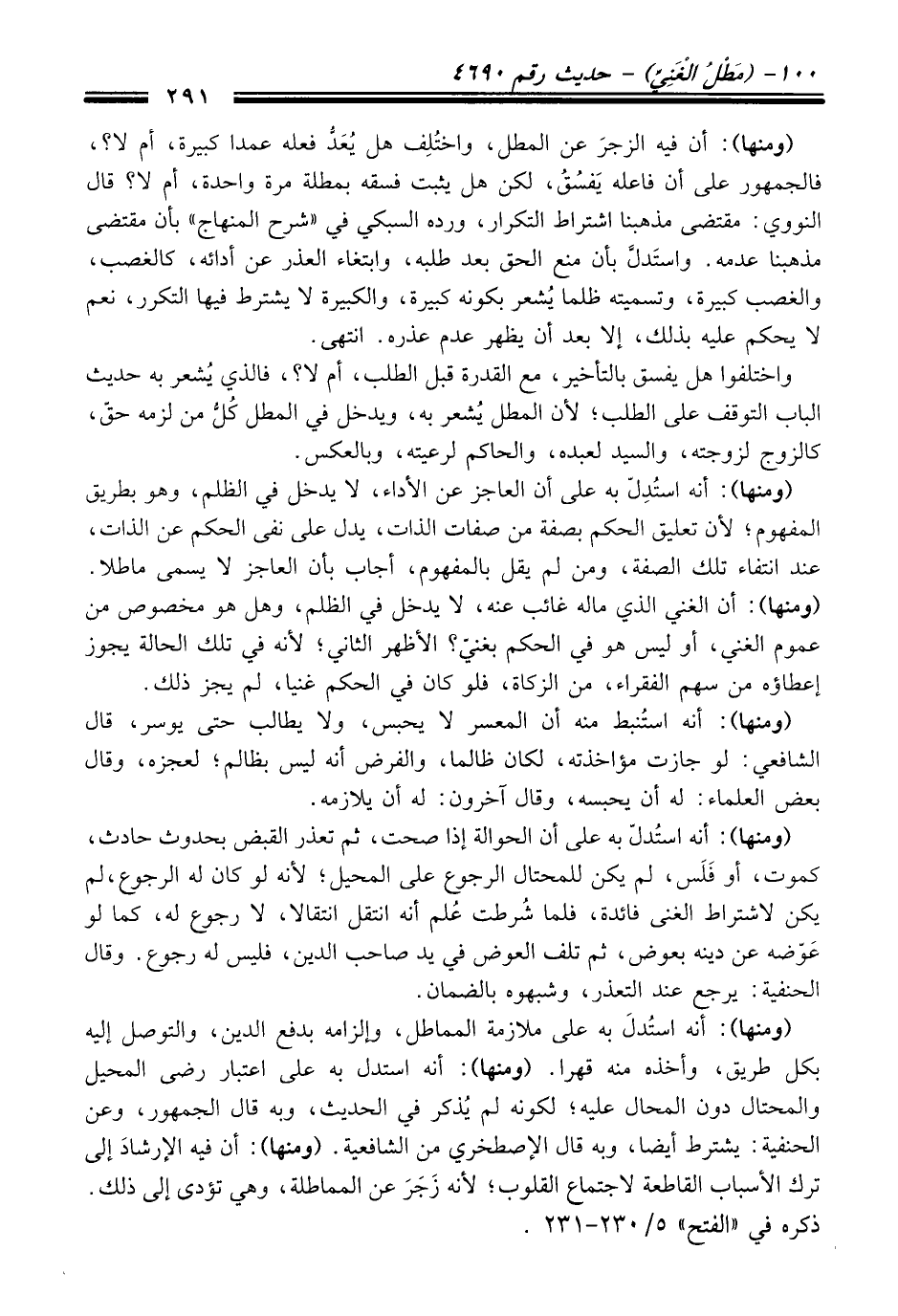(ومنها): أن فيه الزجرَ عن المطل، واختُلِف هل يُعَدُّ فعله عمدا كبيرة، أم لا؟، فالجمهور عَلَى أن فاعله يَفسُقُ، لكن هل يثبت فسقه بمطلة مرة واحدة، أم لا؟ قَالَ النوويّ: مقتضى مذهبنا اشتراط التكرار، ورده السبكي فِي "شرح المنهاج" بأن مقتضى مذهبنا عدمه. واستَدلَّ بأن منع الحق بعد طلبه، وابتغاء العذر عن أدائه، كالغصب، والغصب كبيرة، وتسميته ظلما يُشعر بكونه كبيرة، والكبيرة لا يشترط فيها التكرر، نعم لا يحكم عليه بذلك، إلا بعد أن يظهر عدم عذره. انتهى.