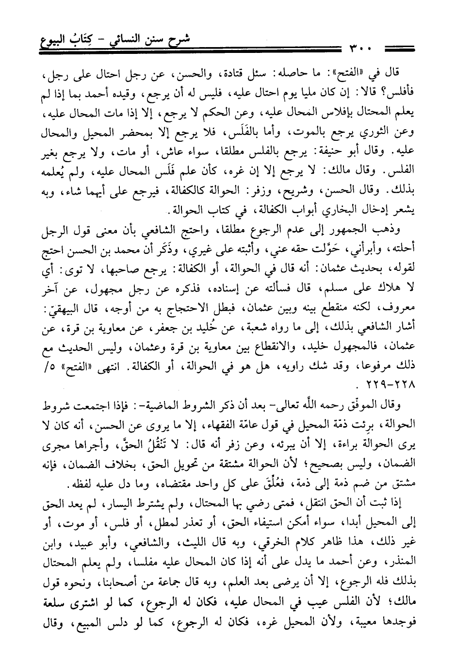 قَالَ فِي "الفتح": ما حاصله: سئل قتادة، والحسن، عن رجل احتال عَلَى رجل، فأفلس؟ قالا: إن كَانَ مليا يوم احتال عليه، فليس له أن يرجع، وقيده أحمد بما إذا لم يعلم المحتال بإفلاس المحال عليه، وعن الحكم لا يرجع، إلا إذا مات المحال عليه، وعن الثوري يرجع بالموت، وأما بالفَلَس، فلا يرجع إلا بمحضر المحيل والمحال عليه. وَقَالَ أبو حنيفة: يرجع بالفلس مطلقا، سواء عاش، أو مات، ولا يرجع بغير الفلس. وَقَالَ مالك: لا يرجع إلا إن غره، كأن علم فَلَس المحال عليه، ولم يُعلمه بذلك. وَقَالَ الحسن، وشريح، وزفر: الحوالة كالكفالة، فيرجع عَلَى أيهما شاء، وبه يشعر إدخال البخاريّ أبواب الكفالة، فِي كتاب الحوالة.
