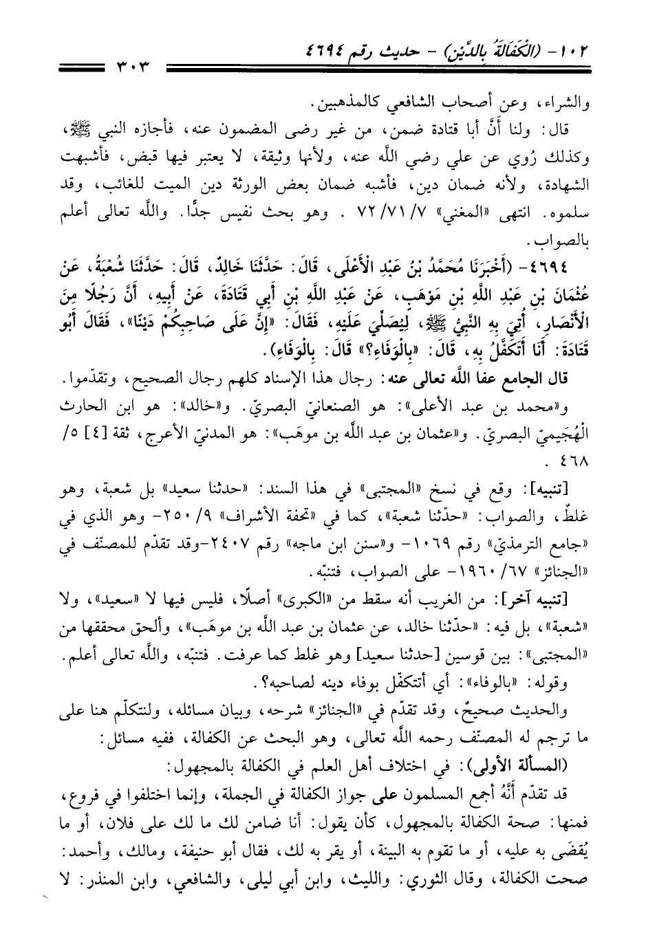 4694 - (أَخْبَرَنَا مُحَمَّدُ بْنُ عَبْدِ الأَعْلَى، قَالَ: حَدَّثَنَا خَالِدٌ، قَالَ: حَدَّثَنَا شُعْبَةُ، عَنْ عُثْمَانَ بْنِ عَبْدِ اللَّهِ بْنِ مَوْهَبٍ، عَنْ عَبْدِ اللَّهِ بْنِ أَبِي قَتَادَةَ، عَنْ أَبِيهِ، أَنَّ رَجُلاً مِنَ الأَنْصَارِ، أُتِيَ بِهِ النَّبِيُّ -صلى الله عليه وسلم-، لِيُصَلِّيَ عَلَيْهِ، فَقَالَ: "إِنَّ عَلَى صَاحِبِكُمْ دَيْنًا"، فَقَالَ أَبُو قَتَادَةَ: أَنَا أَتَكَفَّلُ بِهِ، قَالَ: "بِالْوَفَاءِ؟ "، قَالَ: بِالْوَفَاءِ).