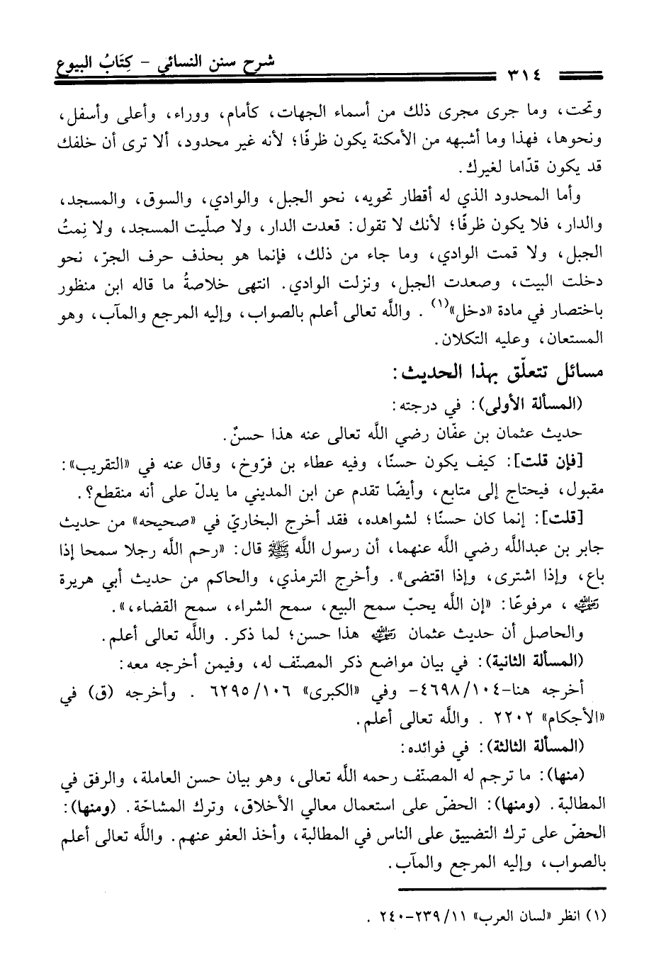 وأما المحدود الذي له أقطار تحويه، نحو الجبل، والوادي، والسوق، والمسجد، والدار، فلا يكون ظرفًا؛ لأنك لا تقول: قعدت الدار، ولا صلّيت المسجد، ولا نِمتُ الجبل، ولا قمت الوادي، وما جاء منْ ذلك، فإنما هو بحذف حرف الجرّ، نحو دخلت البيت، وصعدت الجبل، ونزلت الوادي. انتهى خلاصةُ ما قاله ابن منظور باختصار فِي مادة "دخل" (¬1). والله تعالى أعلم بالصواب، وإليه المرجع والمآب، وهو المستعان، وعليه التكلان.