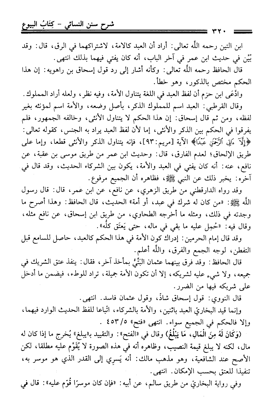 وَقَالَ القرطبيّ: العبد اسم للمملوك الذكر، بأصل وضعه، والأمة اسم لمؤنثه بغير لفظه، ومن ثم قَالَ إسحاق: إن هَذَا الحكم لا يتناول الأنثى، وخالفه الجمهور، فلم يفرقوا فِي الحكم بين الذكر والأنثى، إما لأن لفظ العبد يراد به الجنس، كقوله تعالى: {إِلَّا آتِي الرَّحْمَنِ عَبْدًا} الآية [مريم: 93]، فإنه يتناول الذكر والأنثى قطعا، وإما عَلَى طريق الإلحاق؛ لعدم الفارق، قَالَ: وحديث ابن عمر منْ طريق موسى بن عقبة، عن نافع، عنه: أنه كَانَ يفتي فِي العبد والأمة، يكون بين الشركاء الْحَدِيث، وَقَدْ قَالَ فِي آخره: يخبر ذلك عن النبيّ -صلى الله عليه وسلم-، فظاهره أن الجميع مرفوع.