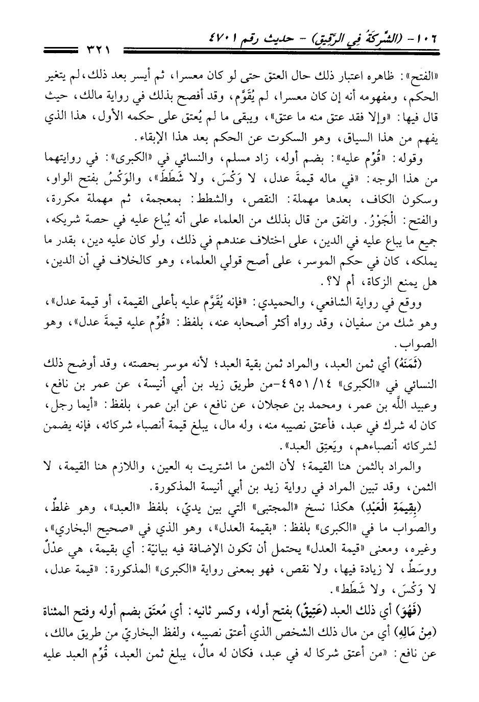 ووقع فِي رواية الشافعيّ، والحميدي: "فإنه يُقَوَّم عليه بأعلى القيمة، أو قيمة عدل"، وهو شك منْ سفيان، وَقَدْ رواه أكثر أصحابه عنه، بلفظ: "قُوِّم عليه قيمةَ عدل"، وهو الصواب.
